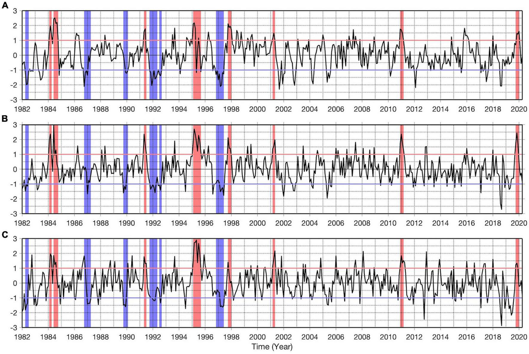 Normalized detrended OI-SST monthly anomalies averaged in the regions of Southern Angola (A), Angola Benguela front (B), and Northern Namibia (C) between January 1982 and April 2020. The red and blue rectangles highlight Benguela Niños and Niñas, respectively. The horizontal red and blue lines indicate the ±1 standard deviation.