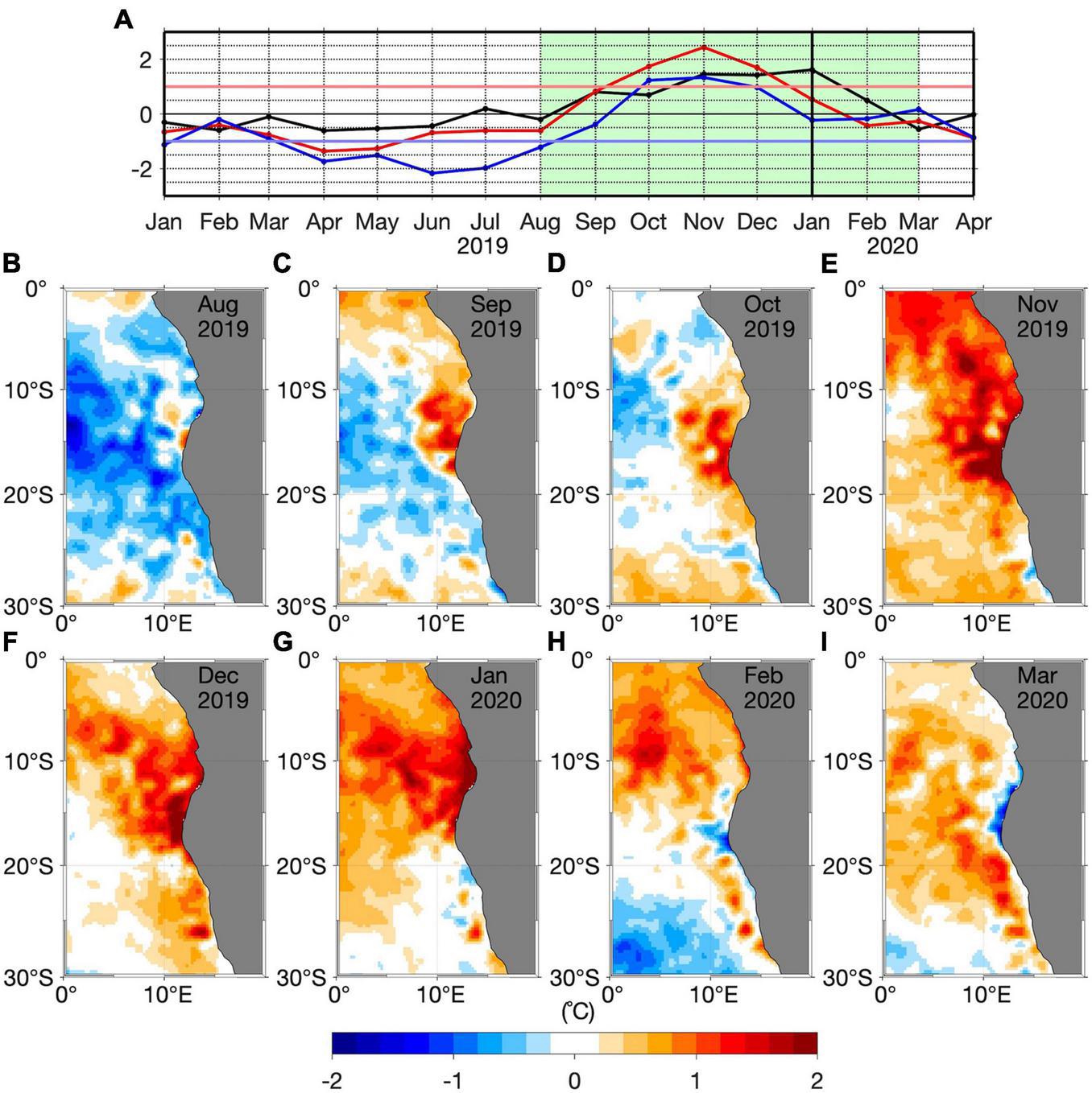 (A) Time series of the normalized detrended OI-SST monthly anomalies from January 2019 to April 2020 shown in Figure 2 for the regions of Southern Angola (black), Angola Benguela front (red) and Northern Namibia (blue). (B–I) Monthly detrended SST anomalies averaged from August 2019 to March 2020 (light green rectangle in panel A).