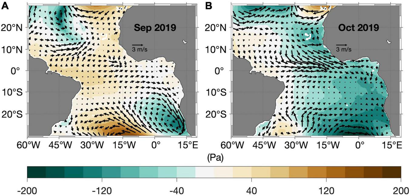 Equatorial zonal wind stress fluctuations (Figure 4B) can excite EKWs impinging at the eastern boundary which force CTWs that propagate poleward along the West African coast and particularly in the Angola Benguela upwelling system. Figure 7A shows the zonal wind anomalies averaged between 40°W – 20°W and 3°S – 3°N (WAtl, blue box in Figure 7C). In the equatorial band, positive (negative) zonal wind anomalies mean weaker (stronger) easterly winds. The time series (Figures 7A,B) show westerly wind anomalies from January 2019 to April 2019 and again from July 2019 to March 2020 with the strongest anomaly occurring in October 2019 (>1 m/s), associated with the zonal SLP gradient observed in Figure 4B. A Hovmøller diagram of daily zonal wind anomalies in the equatorial Atlantic reveals that strong westerly wind anomalies (>1 m/s) prevail between the end of September and October 2019 (Supplementary Figure 2A). However, maximum westerly wind anomalies (>2 m/s) are located north of the equator around 2–7°N and from 35°W to 13°W (Figure 7C) with westerly wind anomalies still found at the equator. Climatologically, there are easterly winds in this region in October with a value of about −1 m/s (not shown). However, this area is also influenced by tropical depressions or cyclones. Particularly in October 2019, north of the equator, strong westerly wind anomalies are induced on the one hand by the zonal pressure gradient (Figure 4B) with positive/negative SLP anomalies to the west/east in the tropical Atlantic. On the other hand, at daily scale, there are strong cyclonic low-pressure events (not shown) that occurred in the area in the second half of October 2019 which could have contributed to maintain the westerly wind anomalies (>3.5 m/s). Figure 7C also shows a slight equatorward shift of the ITCZ in October 2019 (dashed green) compared to its mean October position (dashed blue line). This means that the convergence between the north-easterly and south-easterly trade winds occurred further south.