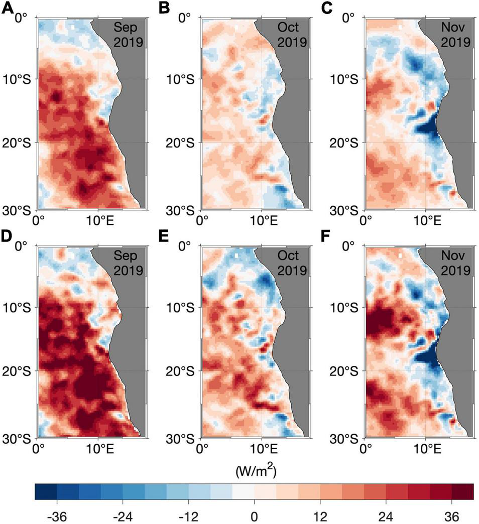 Previous studies evidenced the impact of the local wind fluctuations on the SST variability in the southeastern Atlantic Ocean (Polo et al., 2008; Richter et al., 2010; Lübbecke et al., 2019). In September 2019, north-easterly wind anomalies are present south of 15°S along the West African coast, associated with a local negative SLP anomaly (Figure 4A). As the upwelling in northern Namibia is wind-driven (Jarre et al., 2015), the reduction of the prevailing southerly winds by the northerly wind anomalies south of 15°S is associated with reduced coastal upwelling, possibly resulting in the onset of the local warming observed in September 2019 (Figure 3C). In addition, the weakening of the local winds (Supplementary Figure 1A) is consistent with a reduction of the latent heat loss from the ocean to the atmosphere with anomalies greater than 20 W/m2 (Figure 5A) even though the specific humidity difference (qa – qw, Supplementary Figure 1D) might also contribute. Positive anomalies of qa – qw observed in Supplementary Figure 1D suggest that the air temperature at 10 m is higher than the SST. However, Supplementary Figure 1A reveals that the wind speed anomalies (<2 m/s) are the major contributor to the anomalous latent heat flux compared to qa – qw which shows quite weak anomalies (<1 g/kg) south of 15°S (Supplementary Figure 1D). It is thus unlikely that an enhanced air temperature played an important role in the reduction of the latent heat loss from the ocean to the atmosphere during the 2019 Benguela Niño, as was observed for other warm events such as the Ningaloo Niño in the southeast Indian Ocean (Zhang et al., 2018; Guo et al., 2020). We conclude that the reduction in coastal upwelling caused by weakened local winds and the reduction of the latent heat loss from the ocean to the atmosphere resulted in the warming south of 15°S in September 2019. The onset of the warming north of 15°S will be discussed below. However, the observed offshore cold SST anomalies in September 2019 (Figure 3C) seems to be damped by the reduction of the latent heat loss from the ocean to atmosphere (Figure 5A) resulting in reduced cold SST anomalies in October 2019 (Figure 3D). The amplitude of the latent heat flux anomaly has considerably reduced from September to October 2019 (<15 W/m2, Figure 5B), but remained positive south of 15°S. Also, a damping of the warm SST anomalies north of 25°S (Figure 3E) during the peak of the warm event in November 2019 is suggested by the presence of a strong latent heat loss from the ocean to the atmosphere (Figure 5C) along the Southwest African coast. The strong latent heat loss is explained in this case by the negative anomalies of qa – qw (<−2 g/kg) in the Angola Benguela front region (Supplementary Figure 1F) as the wind speed anomalies are quite weak (Supplementary Figure 1C). Negative anomalies of qa – qw highlight that in November 2019 the sea surface was warmer than the air above, due to strong sea surface temperature anomalies. Noteworthy, the similarity between the latent heat flux anomalies and the net surface heat flux anomalies, suggests the dominant role of the latent heat flux. Figure 5D shows that the ocean gains heat in September 2019 south of 15°S (>30 W/m2). Positive anomalies of net surface heat flux in October 2019 (Figure 5E) and still reduced upwelling-favoring winds (Figure 4B) could have maintained the local warm SST between September–October 2019 in the Angola Benguela front region. Consistent with Figure 5C, in November 2019, the net surface heat flux anomaly patterns show a damping of the warm SST anomalies (Figure 5F) with net surface heat flux anomalies of less than −30 W m–2.