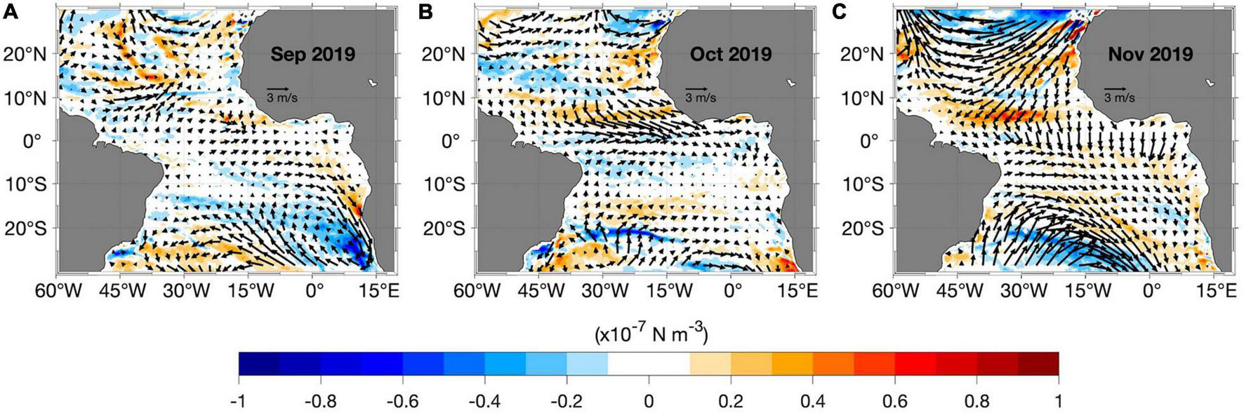 (A–C) Monthly detrended anomalies of wind stress curl (shading) estimated from ERA5 surface winds (arrows) from September to November 2019. The anomalies are calculated relative to the period January 1982 and April 2020.