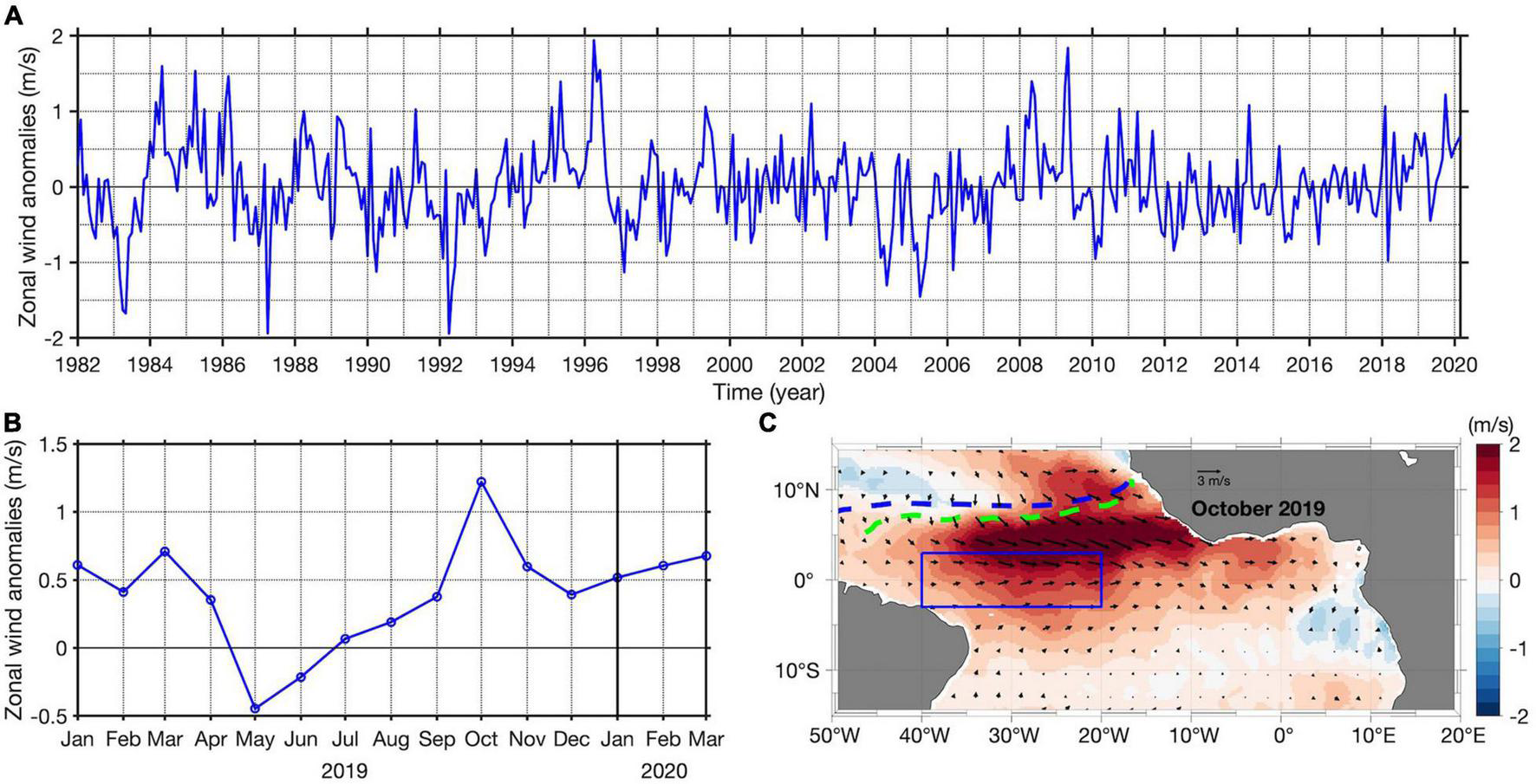 (A) Detrended anomalies of ERA5 zonal wind averaged between 40°W and 20°W, 3°S–3°N [WAtl, blue box in panel C] from January 1982 to April 2020. (B) Zoom in 2019–2020 of the zonal wind anomalies time series in panel A). (C) Detrended anomalies of zonal wind (shading) and surface winds (arrows) in October 2019. The dashed blue line represents the climatological mean position of the Intertropical convergence zone (ITCZ) in October. The dashed green line represents the position of the ITCZ during October 2019.