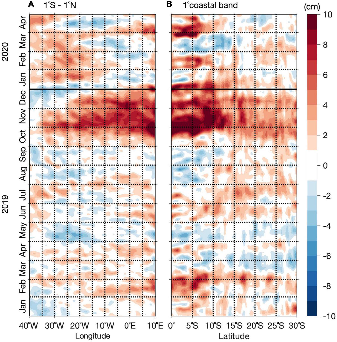 Hovmøller diagram of detrended SLA along the equator (averaged over 1°S – 1°N) from 40°W to the African coastline in panels (A,B) along the Southern African coast (averaged from the coast to 1° offshore) from 0°S to 25°S from January 2019 (bottom) to April 2020 (top). The anomalies are calculated relative to the period January 1993 to April 2020.