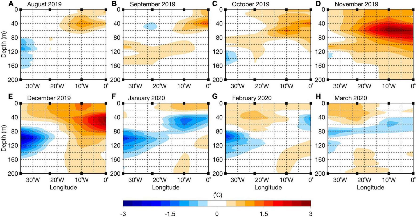 (A–H) Detrended anomalies of temperature in the top 200 m from ePIRATA from August 2019 to March 2020 computed using interpolated temperature fields from the four equatorial moorings located at 35°W, 23°W, 10°W, and 0°E (filled black squares on the x-axes). The data are available from September 1997 to August 2020.