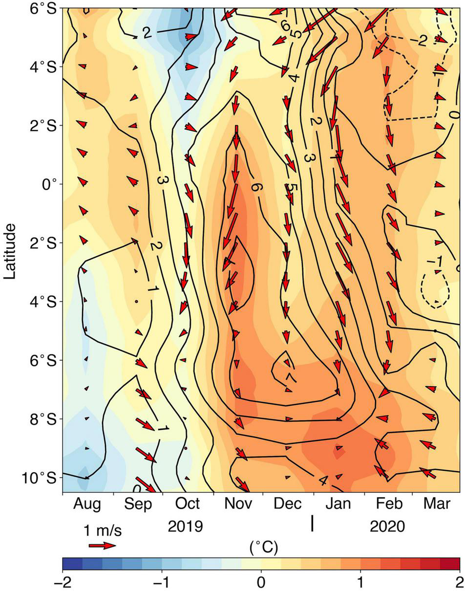 Hovmøller diagram of detrended monthly anomalies of SST (shading), SLA (contours), and surface winds (arrows) averaged between 0°E and 10°E from August 2019 to March 2020. Anomalies are computed relative to the period January 1982 and April 2020.
