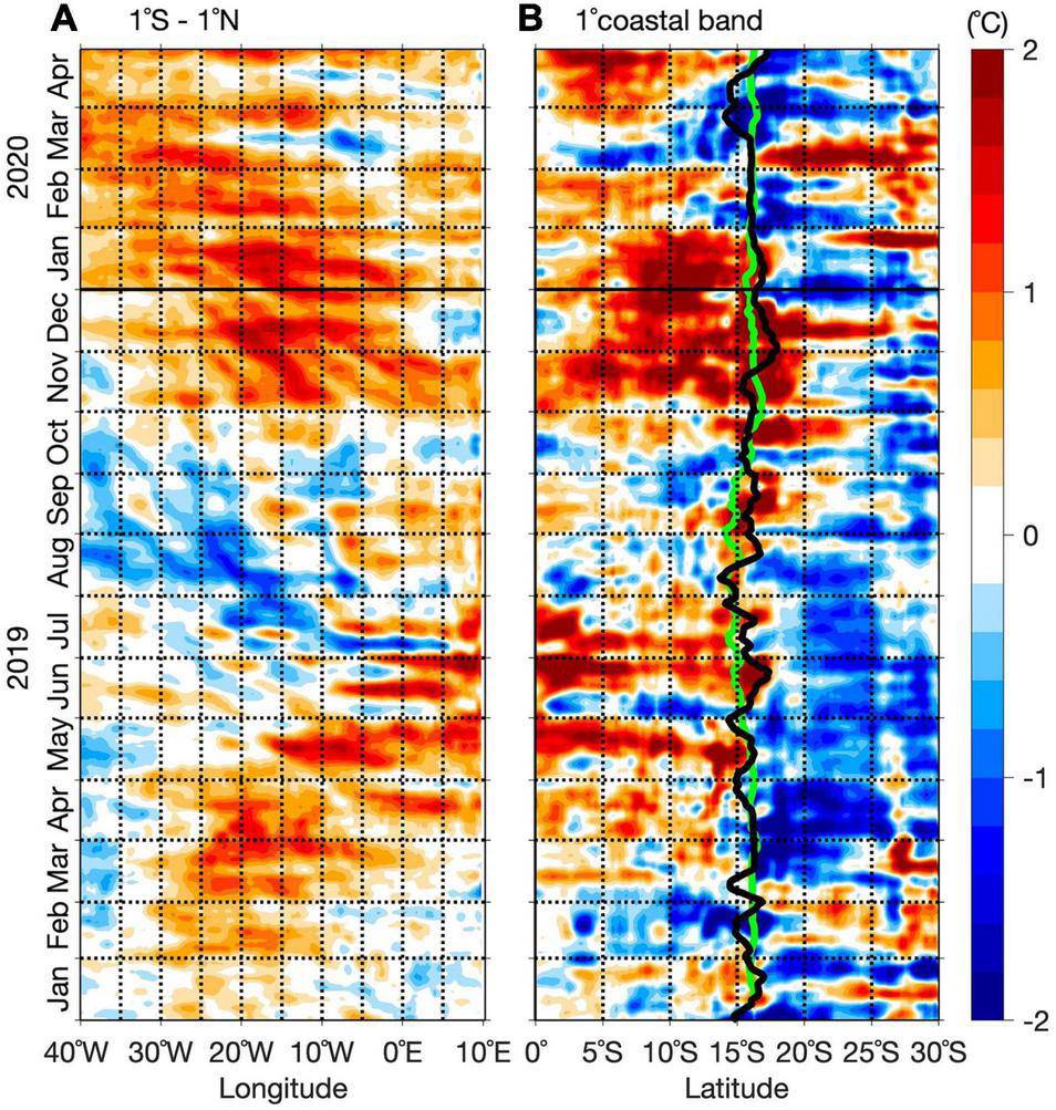 Hovmøller diagram of detrended anomalies of daily SST along the equator (averaged over 1°S – 1°N) from 40°W to the African coastline in panel (A) and along the Southern African coast (averaged from the coast to 1° offshore, in panel (B) from 0°S to 25°S from January 2019 (bottom) to April 2020 (top). Anomalies are computed relative to the period January 1982 and April 2020. The daily mean climatology (anomalies) of the location of the maximum meridional SST gradient is represented in green (black) over Figure 11B. A 10-day running mean is applied to smooth the data.