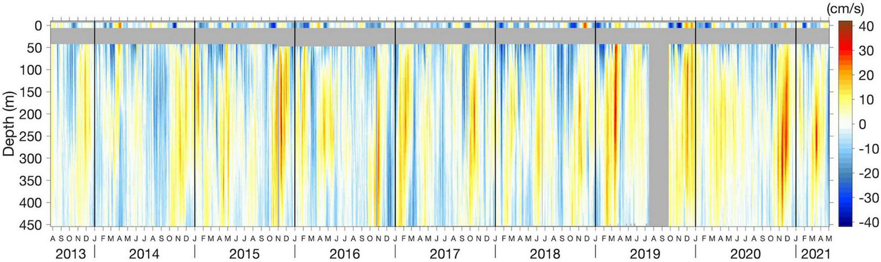 Off Angola (13°00′E; 10°50′S) at around 77 km away from the coast, a current meter mooring is measuring current velocities since July 2013 (Kopte et al., 2017; Imbol Koungue and Brandt, 2021). On the mooring cable, at 500-m depth, an upward-looking 75-kHz Long Ranger Acoustic Doppler current profiler (LR ADCP) is mounted to measure the velocity of the Angola Current up to 45 m below the sea surface with a 16-m bin size as vertical resolution. Current velocities from the moored ADCP are rotated by -34° against North to derive alongshore and cross-shore velocities (positive onshore) according to the local coastal orientation. The data are freely available at https://doi.pangaea.de/10.1594/PANGAEA.939249.