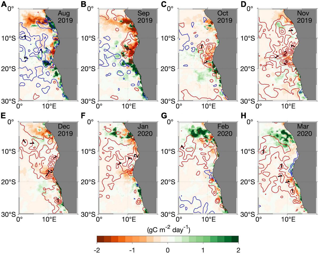 (A–H) Monthly NPP (SST) anomalies in shading (contours) in the southeast Atlantic from August 2019 to March 2020. Blue and red contour intervals are 0.5°C and represent negative and positive SST anomalies, respectively. The anomalies are calculated relative to the period July 2002 to July 2020 for NPP and January 1982 to April 2020 for SST.