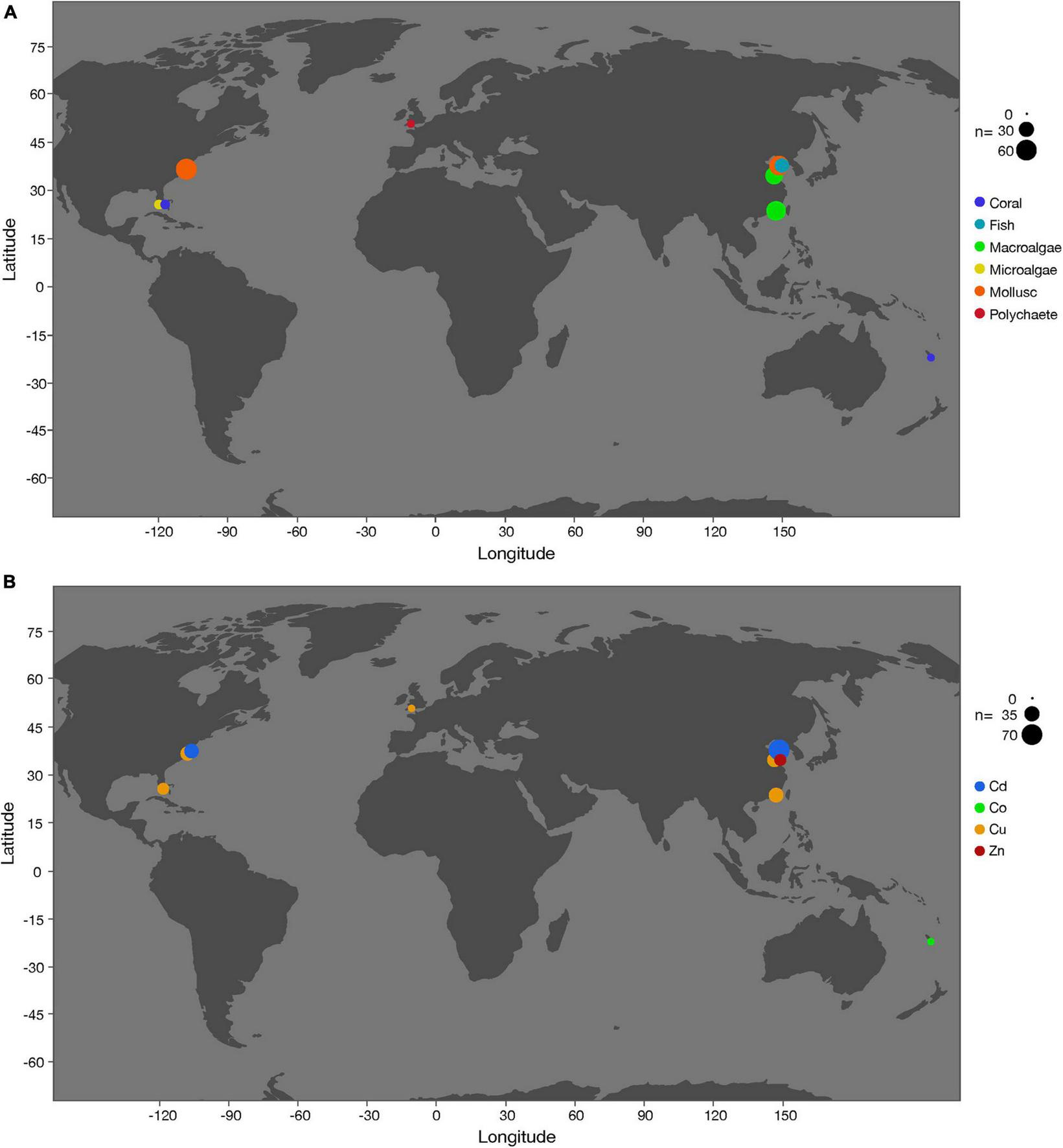 Locations of field studies that investigated the combined effects of ocean acidification and heavy metals (Cd, Co, Cu, Zn) on coral, fish, macroalgae, microalgae, mollusc, and polychaete. Symbol sizes indicate the number of observations. (A) By different taxonomic groups. (B) By different heavy metals.