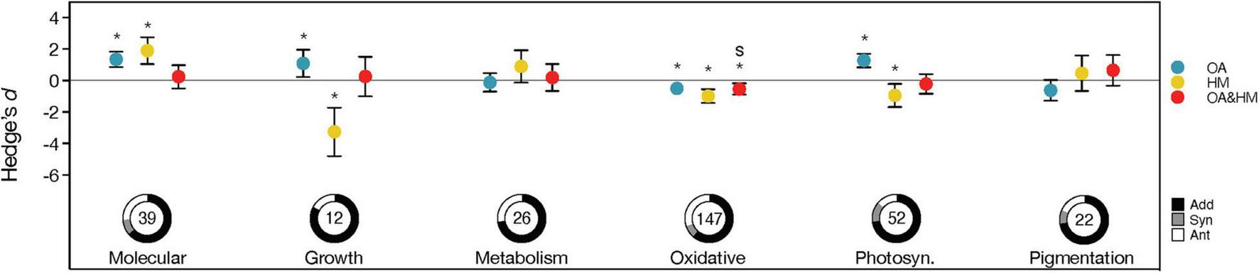 Responses to the effects of ocean acidification (OA) (blue), heavy metals (HM) (yellow) and their interaction (Hedge’s d; red) observed for organismal response levels. For interactions, confidence intervals overlapping 0 indicate additive effects; those > 0 or < 0 indicate a significant interaction (synergistic interactions are highlighted with the letter “s”). Descriptions of the error bars, pie charts, symbols and color coding see Figure 2.