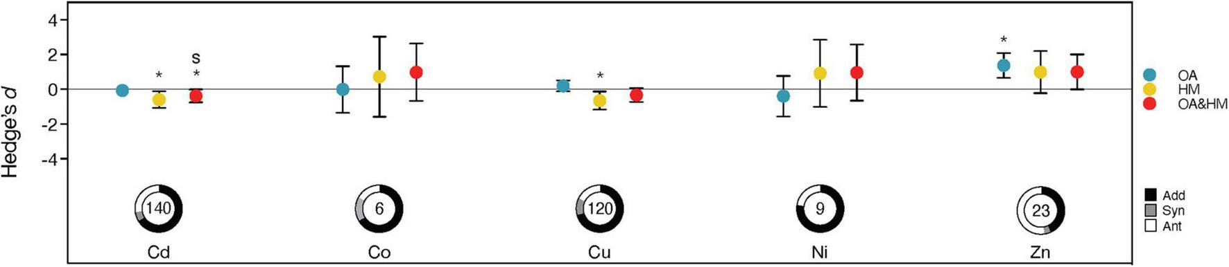 Responses to the effects of ocean acidification (OA) (blue), heavy metals (HM) (yellow) and their interaction (Hedge’s d; red) observed for different metal types. For interactions, confidence intervals overlapping 0 indicate additive effects; those > 0 or < 0 indicate a significant interaction (synergistic interactions are highlighted with the letter “s”). Descriptions of the error bars, pie charts, symbols and color coding see Figure 2.
