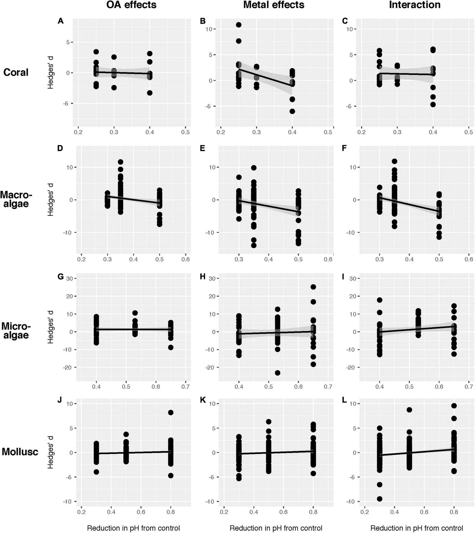 The effect of magnitude of pH reduction on the effect size (Hedge’s d) of ocean acidification (OA) (A,D,G,J), heavy metals (B,E,H,K) and their interaction (C,F,I,L) in various taxonomical groups. (A–C) Coral; (D–F) macroalgae; (G–I) microalgae; (J–L) mollusc. The data were fitted with linear regressions.