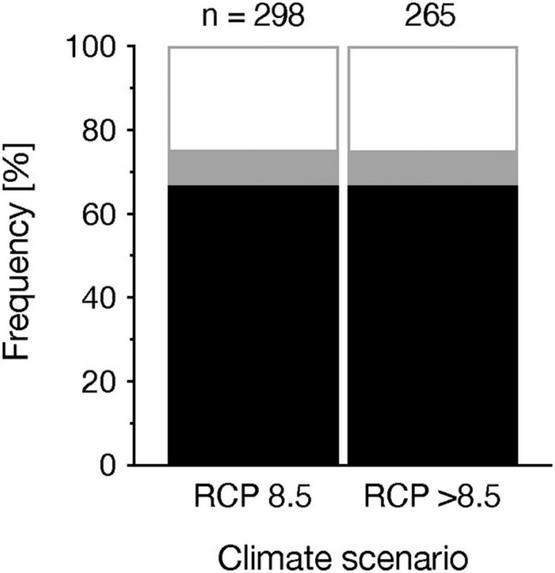 Frequency (in %) of additive (black), synergistic (gray) and antagonistic (white) interactions depending on climate scenario. Values above bars denote the number of observations.
