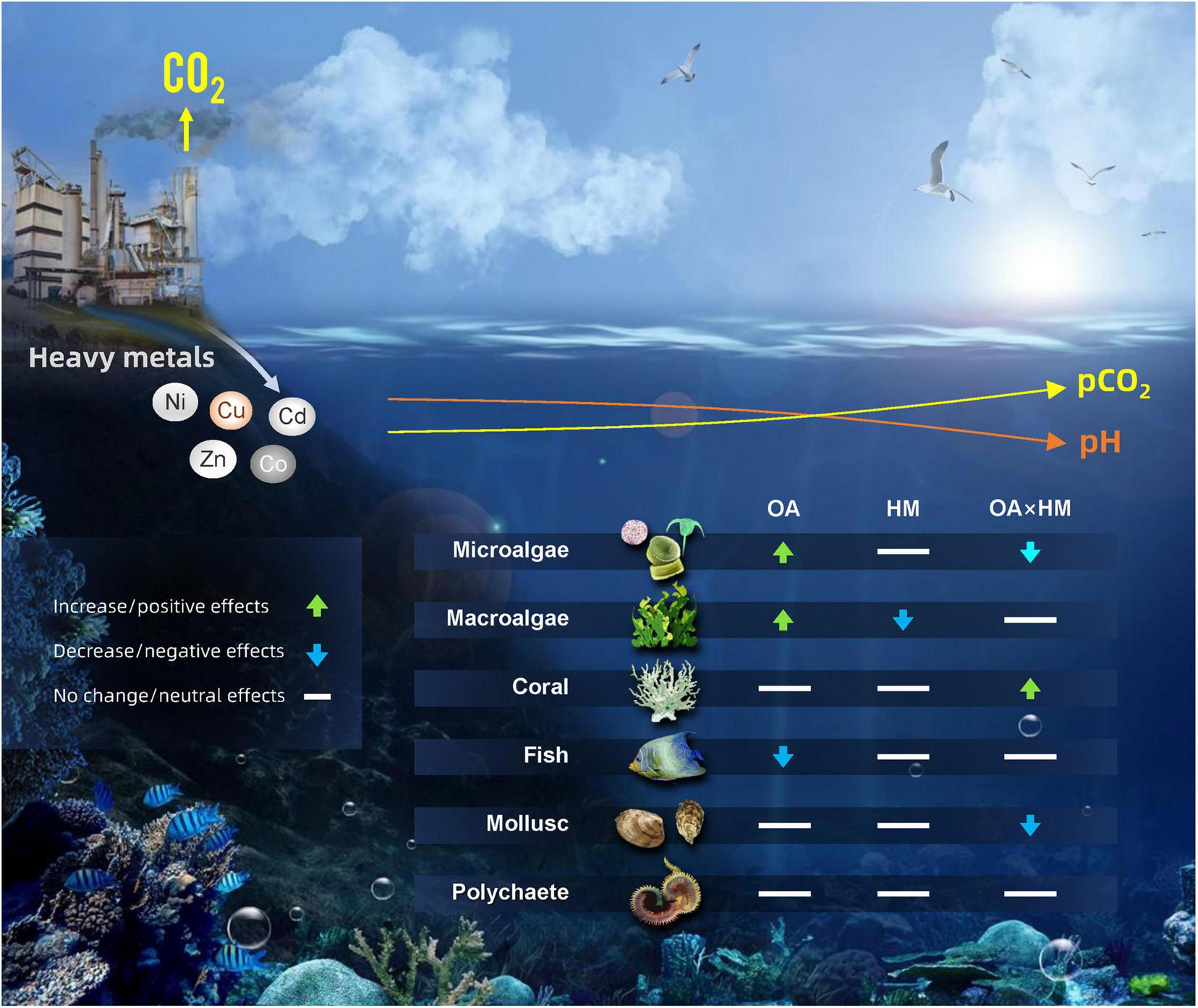 Conceptual diagram illustrating the effects of ocean acidification (OA), heavy metals (HM) and their combination on different taxa (microalgae, macroalgae, coral, fish, mollusc, polychaete) based on the meta-analysis results as shown in the various figures of our study. The arrows indicate the direction of change.