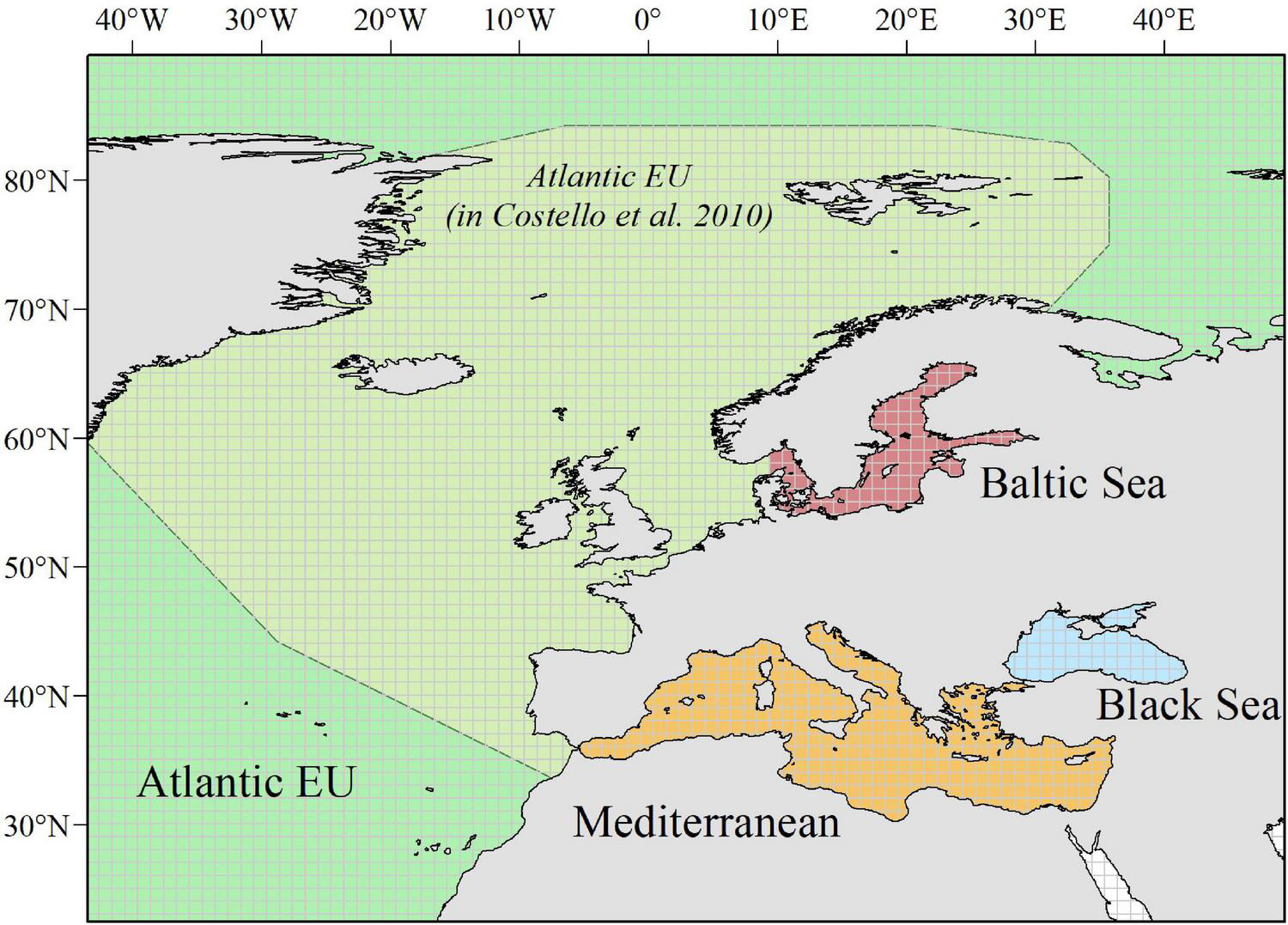Finally, we evaluated the data taxonomical completeness by comparing the total number of species per taxa and basin, with analogous results reported by Costello et al. (2010) and, hence, for the CoML. As the Atlantic EU basin, we considered here a wider area than the one used in Costello et al. (2010), in order to incorporate marine waters around the Macaronesia (including Azores, Madeira, and Canary Islands), and the northernmost Atlantic waters. However, and for comparison purposes, we also considered here what Costello et al. (2010) defined as Atlantic EU (Figure 1). It is also worth noting that the Black Sea constitutes an addition to the basins considered in Costello et al. (2010).