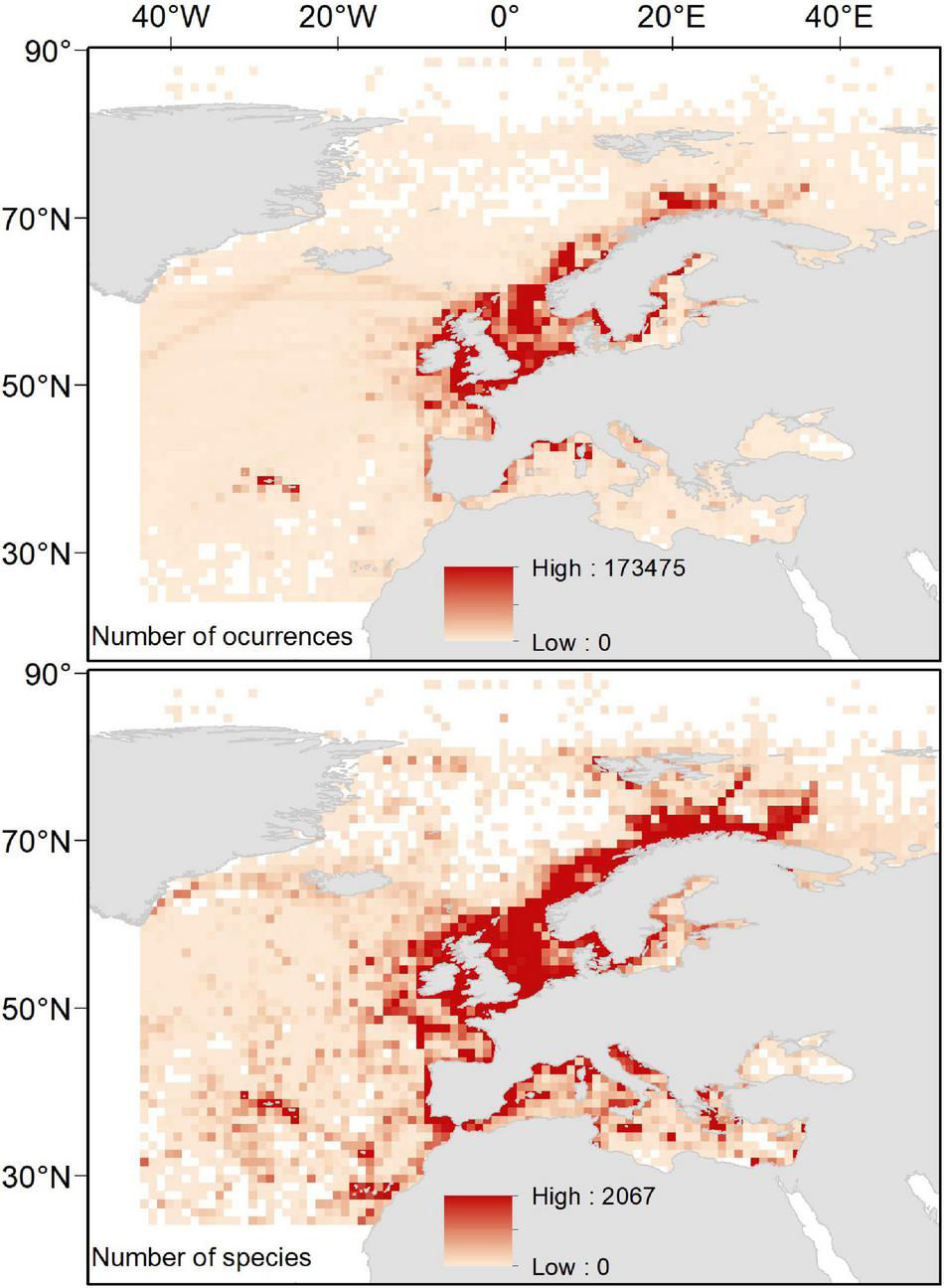 Our spatially explicit proxy to sampling effort (i.e., total number of occurrences per cell) heterogeneously distributed spatially, with the highest sampling effort occurring in the North Sea and coastal areas around the Scandinavian Peninsula, the United Kingdom, the Azores Archipelago, and the North-western Mediterranean Sea. Analogously, our estimates of species richness were heterogeneously distributed, with the highest values largely occurring in those areas with the highest sampling effort. However, other “biodiversity hotspots” with relatively high values of species richness emerged in the northernmost areas of Scandinavian Peninsula (near the Arctic Sea), the Macaronesia (including Azores, Madeira, and Canary Islands), the coastal areas around the Iberian Peninsula, and the northernmost areas of the Western and the Central Mediterranean Sea (including Balearic, Tyrrhenian, and Adriatic Seas; Figure 2).