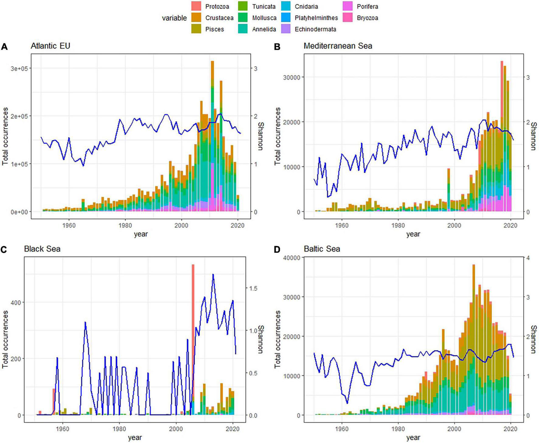Stacked bar plot showing basin-specific trends in the total number of occurrences per taxa along the last decades for the Atlantic EU (A), Mediterranean Sea (B), Black Sea (C), and Baltic Sea (D). Note that first occurrences date back to the XVII century, but here we just represent the 1950–2020 period. Different taxa are represented in colors, and the year-specific Shannon Index (blue line), which considered the relative contribution of particular taxa to the total number of occurrences reported for a given year and basin, was used as an indicator of the completeness in taxonomic sampling along the time-series.