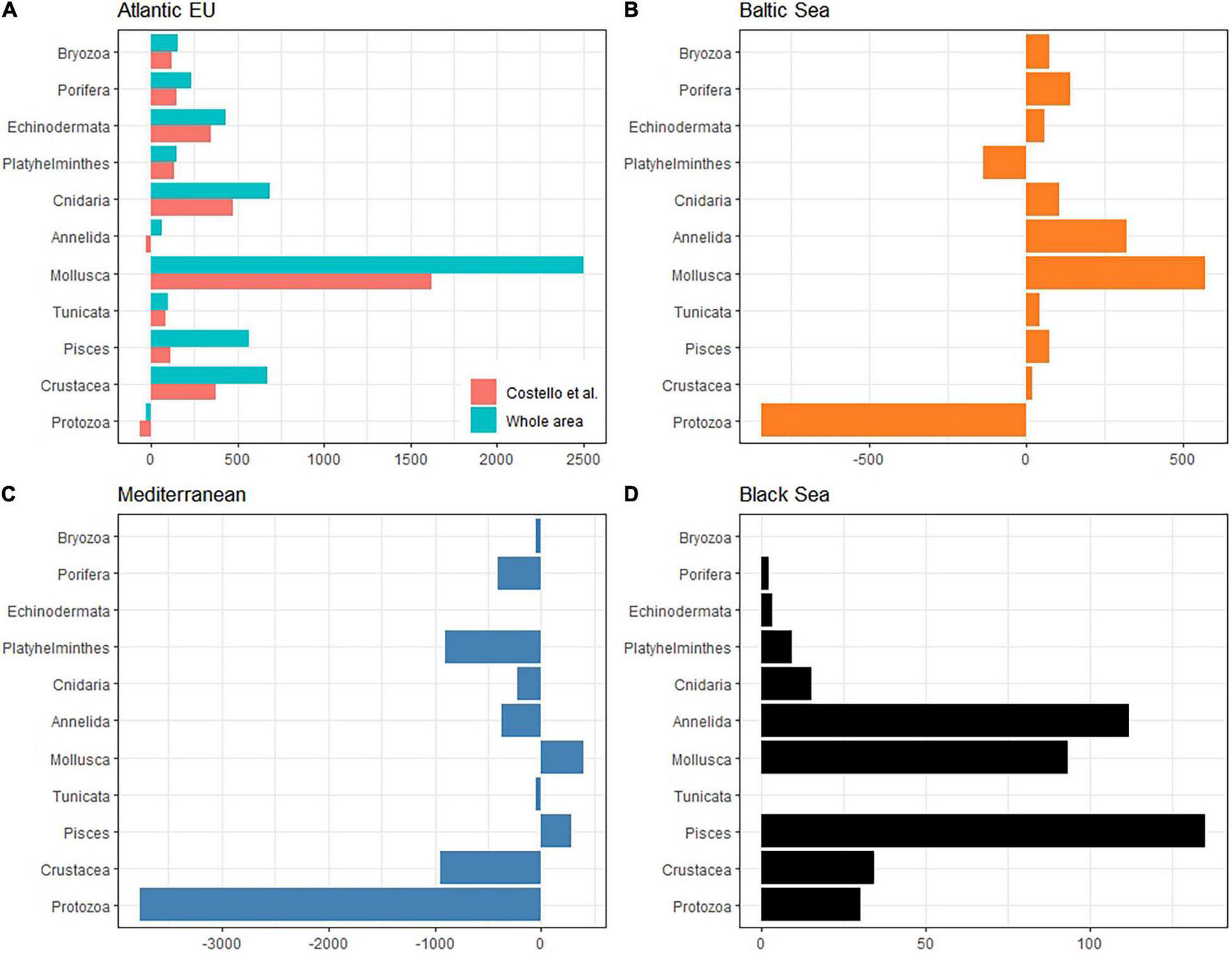 Bar plot showing the difference between the total number of species per taxa reported in GBIF with respect to analogous results from Costello et al. (2010). Comparisons have been made for the Atlantic EU (A), Mediterranean Sea (B), Black Sea (C), and Baltic Sea (D). Positive values indicate a higher number of species reported in GBIF. What we consider here as Atlantic EU (whole area) differs from Costello et al. (2010) in that we also include marine waters around the Macaronesia (including Azores, Madeira, and Canary Islands), and the northernmost Atlantic waters (see Figure 1). For comparative purposes, we also consider the same Atlantic EU area as Costello et al. (2010). Note also that Costello et al. (2010) did not report biodiversity data for the Black Sea.