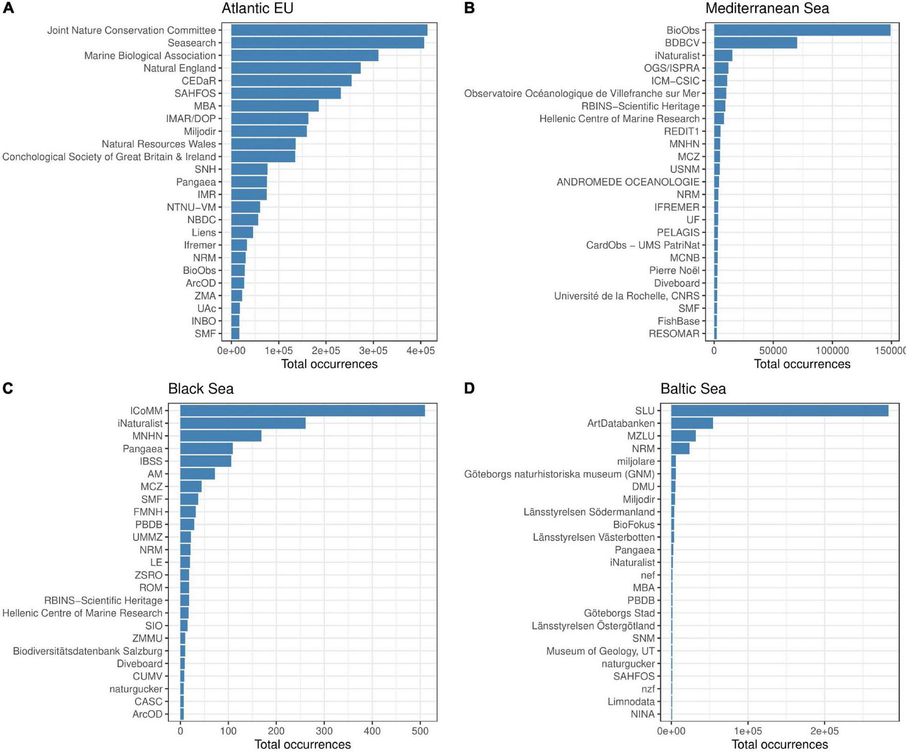 Bar plot showing the total number of occurrences reported by single Institutions for the basins considered in the study. Information on main contributors is provided for the Atlantic EU (A), Mediterranean Sea (B), Black Sea (C), and Baltic Sea (D). We focused on the top 25 contributors for visualization purposes. However, these top contributors account for most of the reported occurrences (ca. 90% in the Atlantic EU and the Mediterranean Sea, and almost 100% in the Baltic and the Black Seas, see Supplementary Table 2).