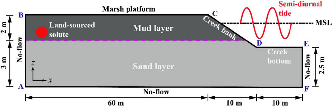 The model shown in Figure 1 represents a 2D cross-creek transect that was assumed to be layered (a low-permeability mud layer overlying a high-permeability sandy layer) (Gardner, 2007). The dimensions of the model are based on previous numerical studies of the subsurface hydrodynamics in salt marshes (Gardner, 2005; Wilson and Gardner, 2006). This study neglected the fresh groundwater input from the upland, so the numerical model was representative of salt marshes during dry seasons. Corresponding, the inland boundary AB was set as no-flow. The right vertical boundary EF, which represents the hydraulic divide, and the marsh bottom AF, were also assigned a no-flow boundary. The marsh platform BC and tidal creek CDE, which combine to form the sediment-water interface (SWI), were set as pressure-specified boundaries according to a semidiurnal tidal signal described as Htide(t) = Hmsl + Asin(ωt), with Htide(t) [L] being the time-varying creek water level, Hmsl [L] being the mean sea level (MSL, set to 4.2 m), A [L] being the tidal amplitude (set as 1 m), and ω [T–1] being the angular frequency (0.5326 rad h–1 based on a tidal period of 12 h). Note that the tidal signals in some salt marshes fluctuate over a longer period (e.g., spring-neap tides) and lead to more complex pore water flow dynamics (Xin et al., 2010a). Moreover, evaporation and precipitation, which would alter the salinity contrast between surface and subsurface water, was also ignored in this study. Nevertheless, the neglection of these factors allowed us to better focus on the role of soil stratigraphy.