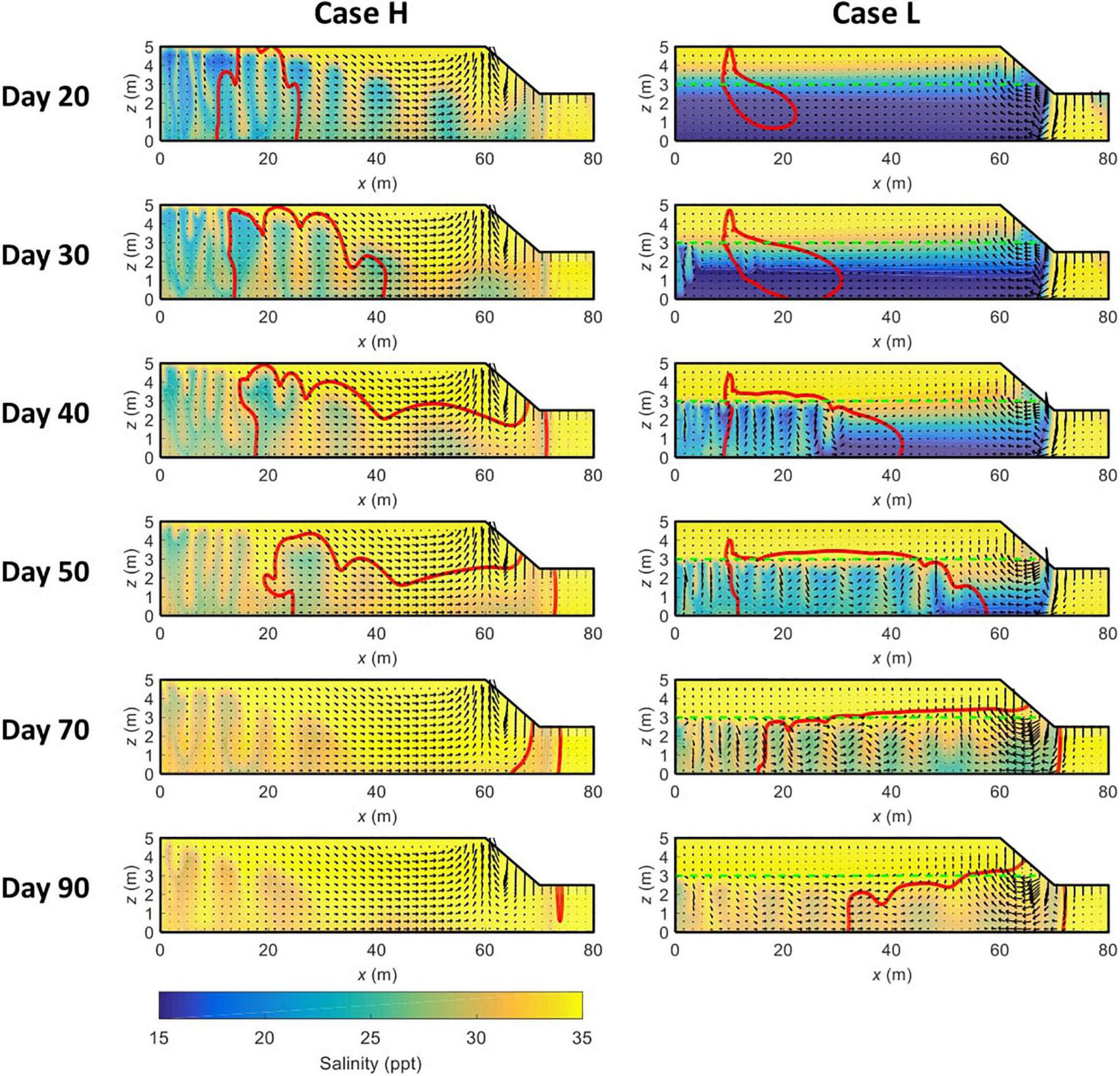 The simulated salinity distributions, solute transport path and flow field in Cases 1–2 are shown in Figure 2. Unstable flow occurs in both cases, with salt fingers initially forming near the inland boundary, where density effect is dominant and the advection process is much weaker. The formation of unstable flow is early in Case H and considerably delayed in Case L. For example, by Day 30, the flow instability has been quite fully developed in Case H, whereas there are only a few small salt fingers forming near the inland boundary in Case L. The comparison indicates that the low-permeability mud layer delays the formation of unstable flow in marsh sediments. Moreover, it is noteworthy that, in Case L, the unstable flow does not occur until the infiltrating surface water has entered the lower high-permeability sand layer, as reflected by the result of Day 30. Furthermore, in Case H, the sizes of salt fingers near the tidal creek are larger than those in the marsh interior, due to the stronger tide-induced near-creek circulation and hence a weaker role of density-dependent flow. By contrast, the salt finger sizes in Case L are more evenly distributed across the marsh aquifer. This is because the low permeability of the mud layer weakens the tidally driven near-creek circulation, thereby enhancing the role of density effect.