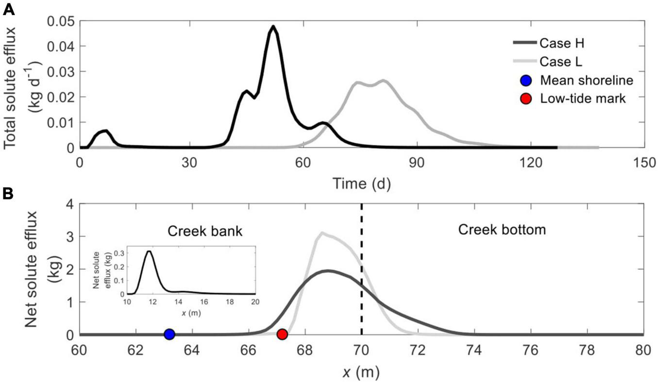 Comparison of (A) time-dependent total solute efflux and (B) spatial distribution of net solute efflux across the SWI (BCDE in Figure 1) between Cases H and L. The blue and red nodes in panel (B) represent the mean shoreline and low-tide mark, respectively, while the vertical dashed line separates creek bank (left) and creek bottom (right). The subplot in panel (B) shows the location of the first discharge episode from the marsh platform in Case H.