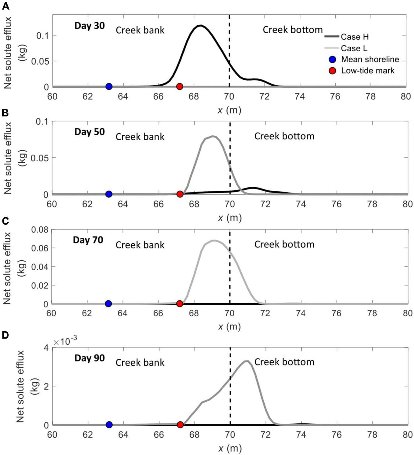 Temporal variations of daily integrated solute effluxes across the sediment–water interface (BCDE in Figure 1) between Cases H and L on (A) Day 30, (B) Day 50, (C) Day 70, and (D) Day 90. The blue and red nodes represent the mean shoreline and low-tide mark, respectively, while the vertical dashed line separates creek bank (left) and creek bottom (right).