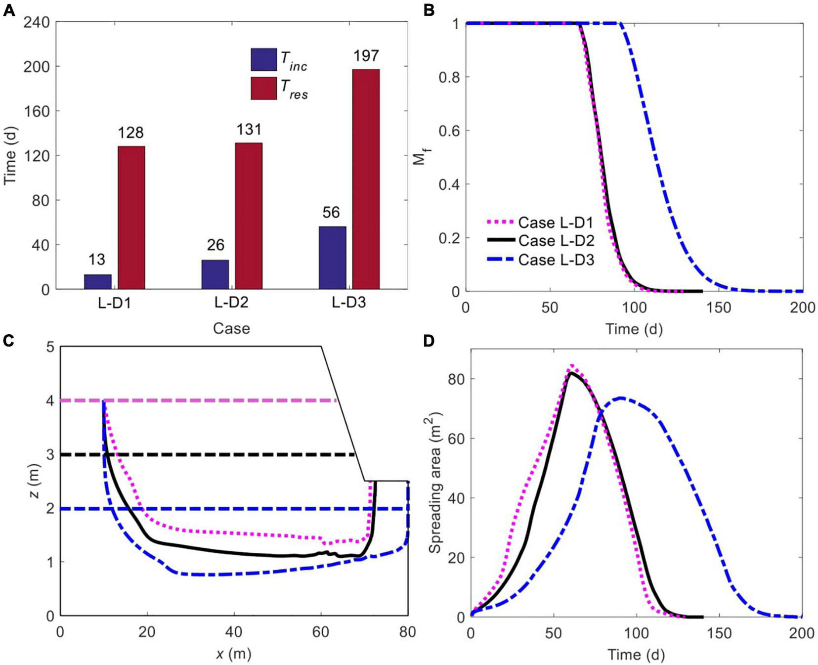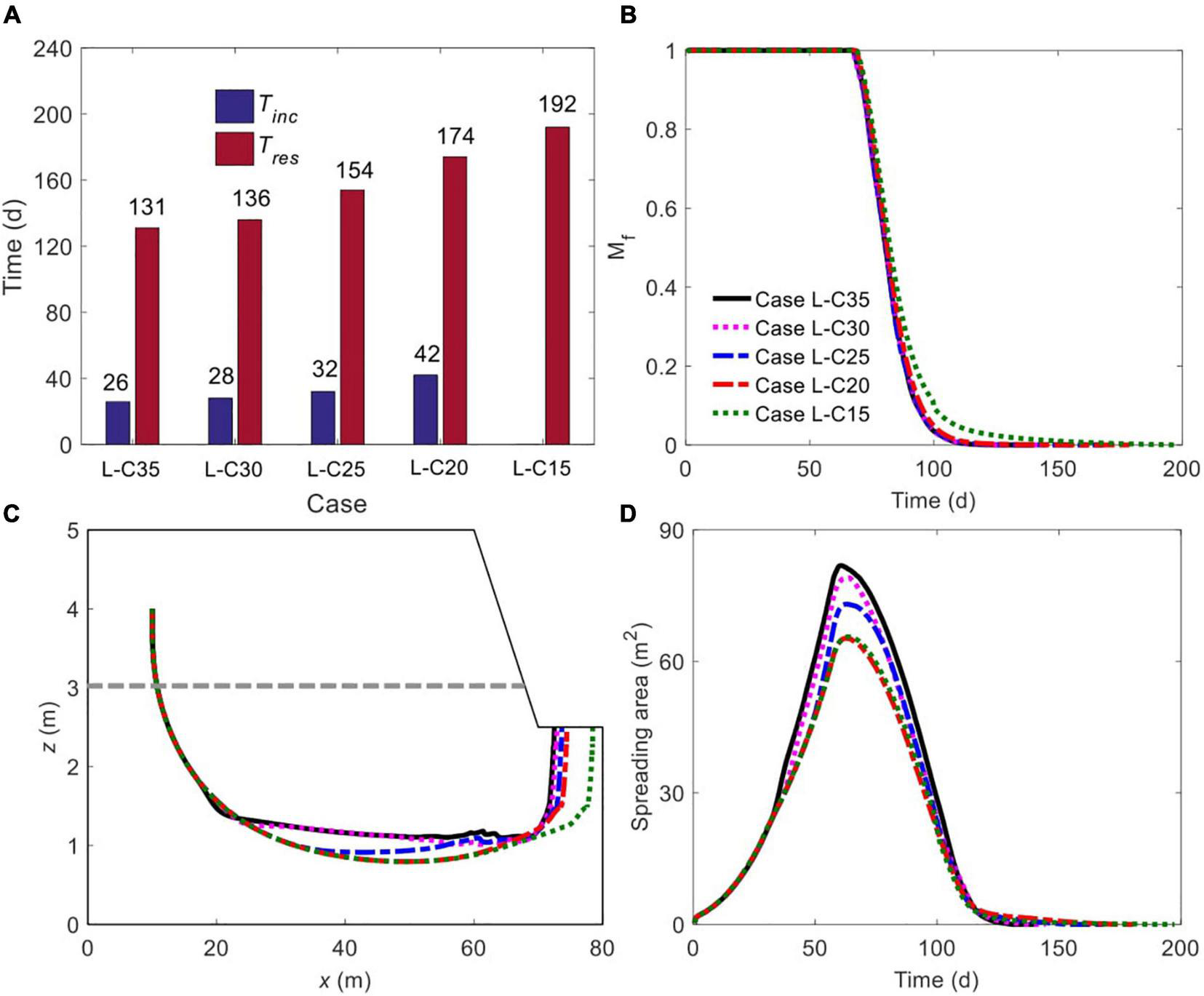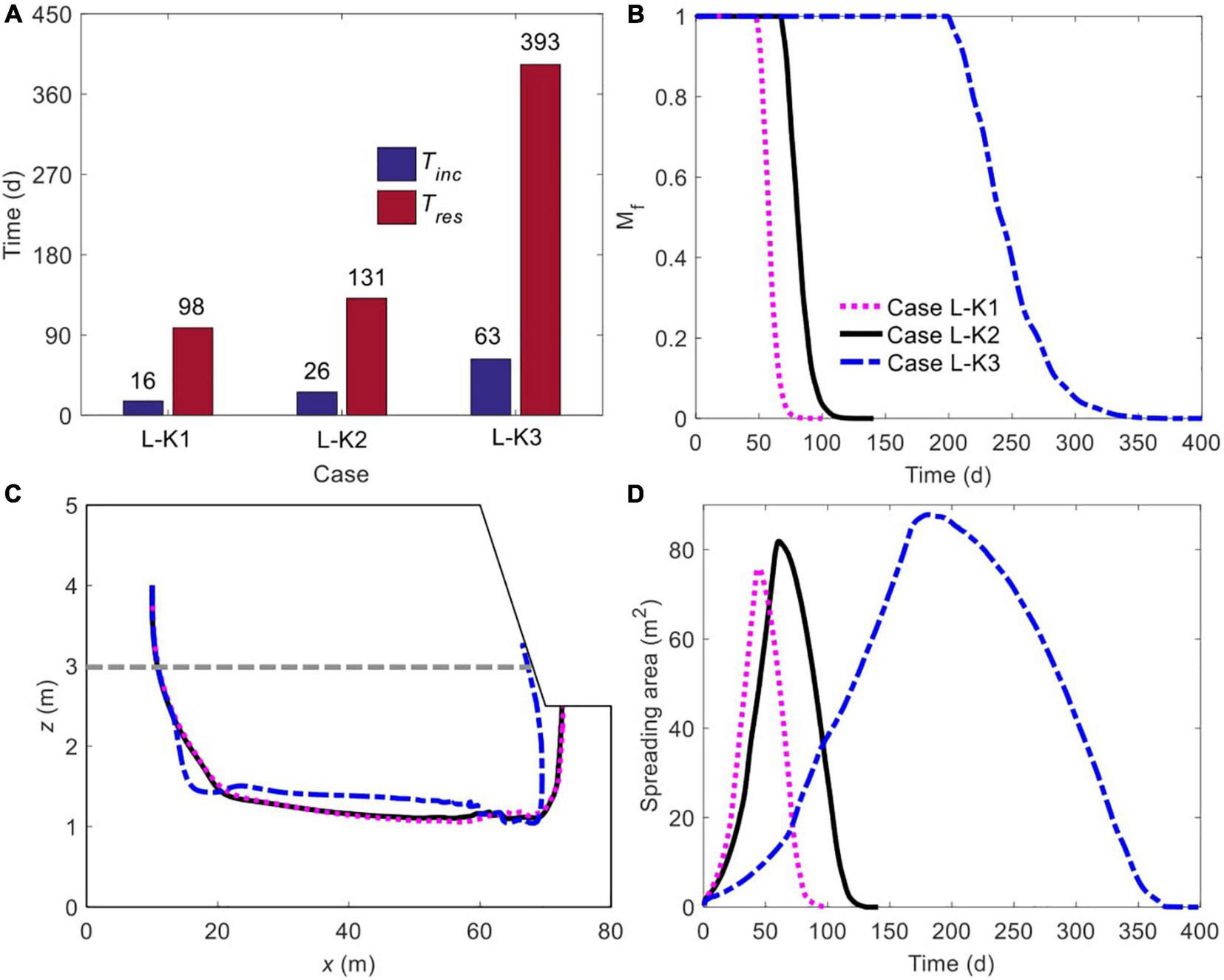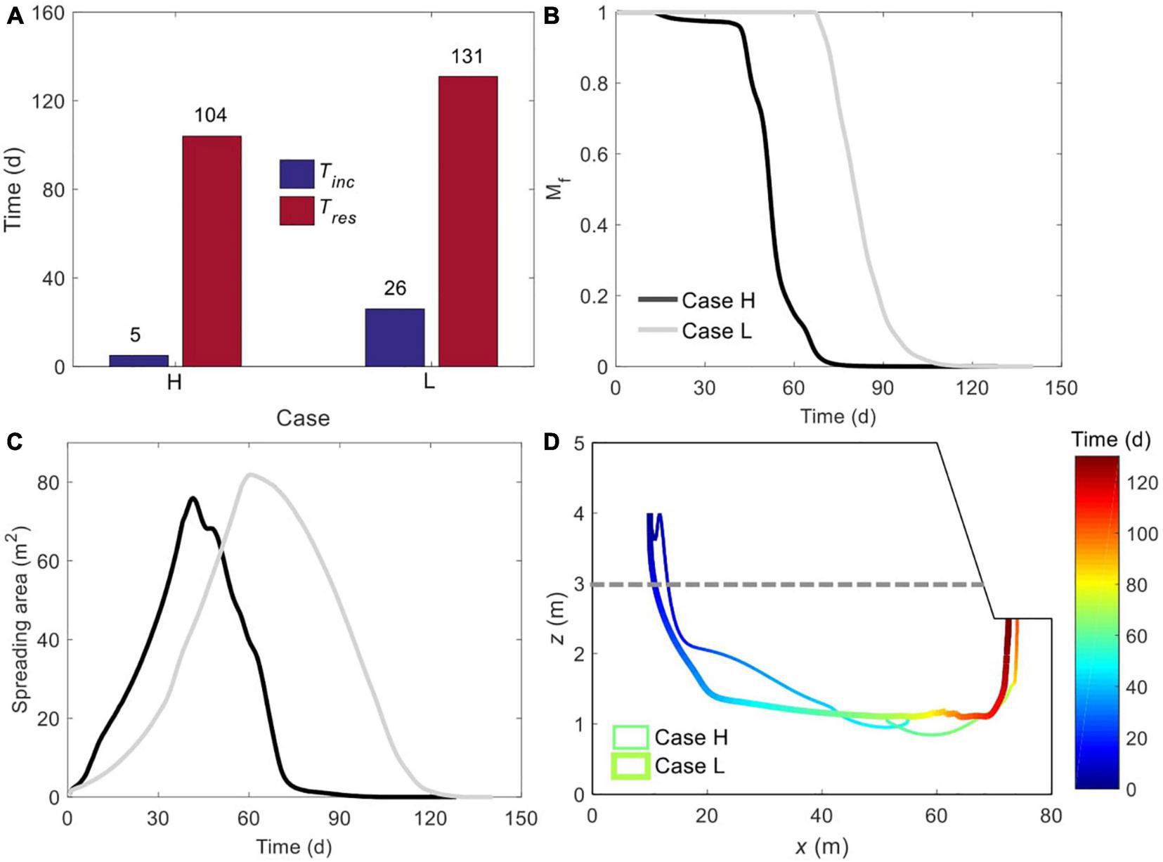 T inc and Tres are highly sensitive to soil stratigraphy, with the former increasing from 5 days in Case H to 26 days in Case L (an increase of 420%), and the latter rising by 26% (104 days in Case H versus 131 days in Case L) (Figure 5A). The variations of normalized residual solute mass in the marsh soil (Mf = M00/M0) in Cases 1 and 2 exhibit the same trend, namely that Mf remains at one before solute discharge, followed by a rapid decrease as the solute plume exits the marsh soils (Figure 5B). In accordance with the results in Figure 2, Mf in Case H falls below one and to zero much earlier than in Case L, revealing the impediment of soil stratigraphy on solute discharge again. Also, corresponding to the early discharge episode shown in Figure 3A, Mf in Case H decreases slightly and maintains at the level for a certain period before rapidly falling.