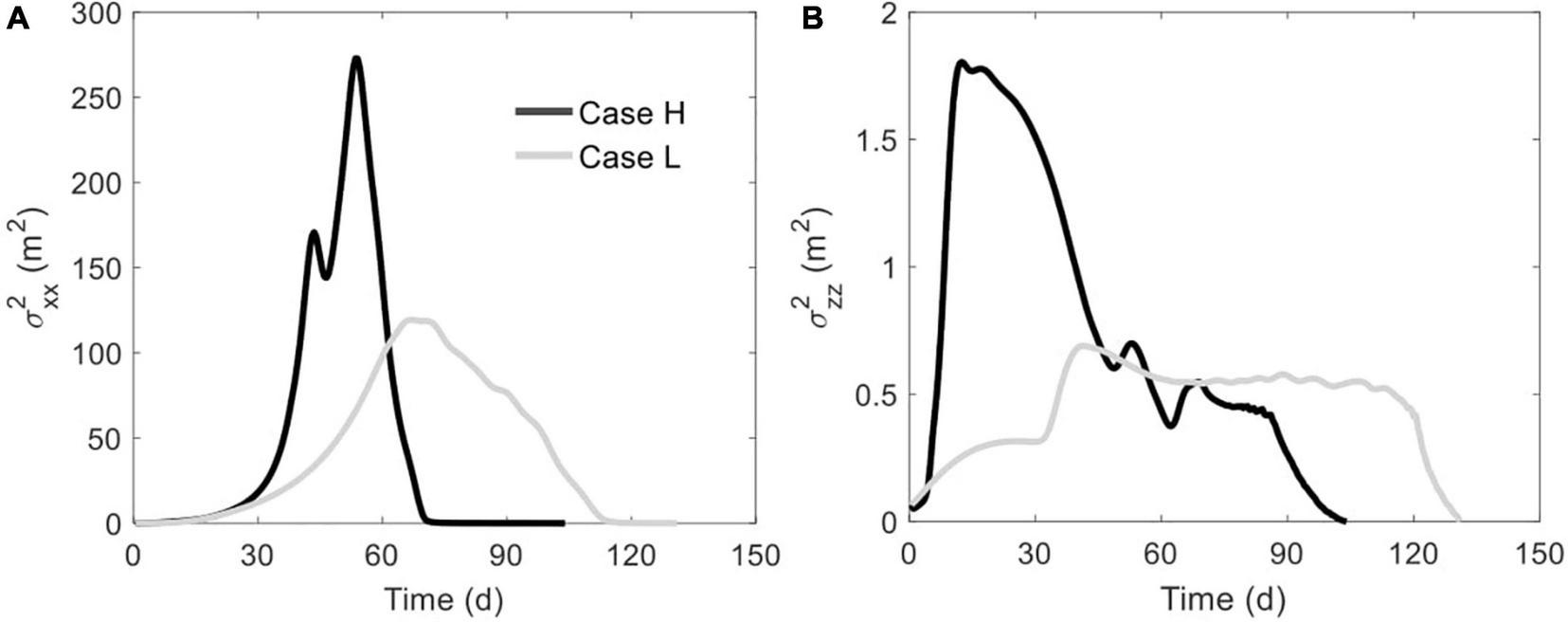 The extents to which the solute plume spreads along the horizontal (x) and vertical (z) directions are indicated by the variances shown in Figures 6A,B, respectively. The variations of plume spreading in Cases 1 and 2 exhibit similarly a rising phase followed by a decreasing phase. Notably, limited by the mud layer, the solute plume in Case L is stretched to a lower degree than that in Case H, along both x- and z-direction. For example, the maximum horizontal variance in Case H is 272.95 m2, more than doubled of the 119.44 m2 in Case L (Figure 6A). Moreover, the oscillations of variances along x- and z-direction in both cases reflect how the dynamic salt fingers associated with the unstable flow may split the solute plume into parts.