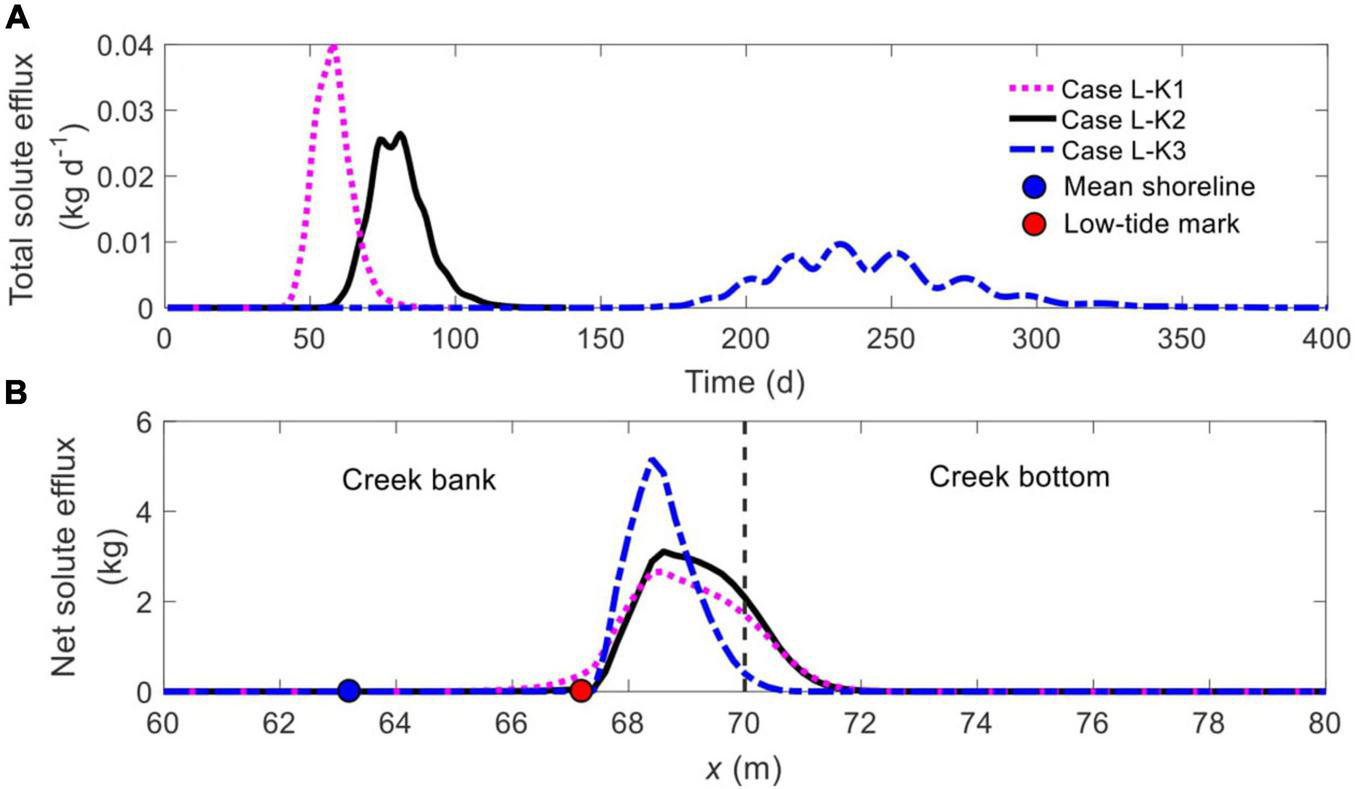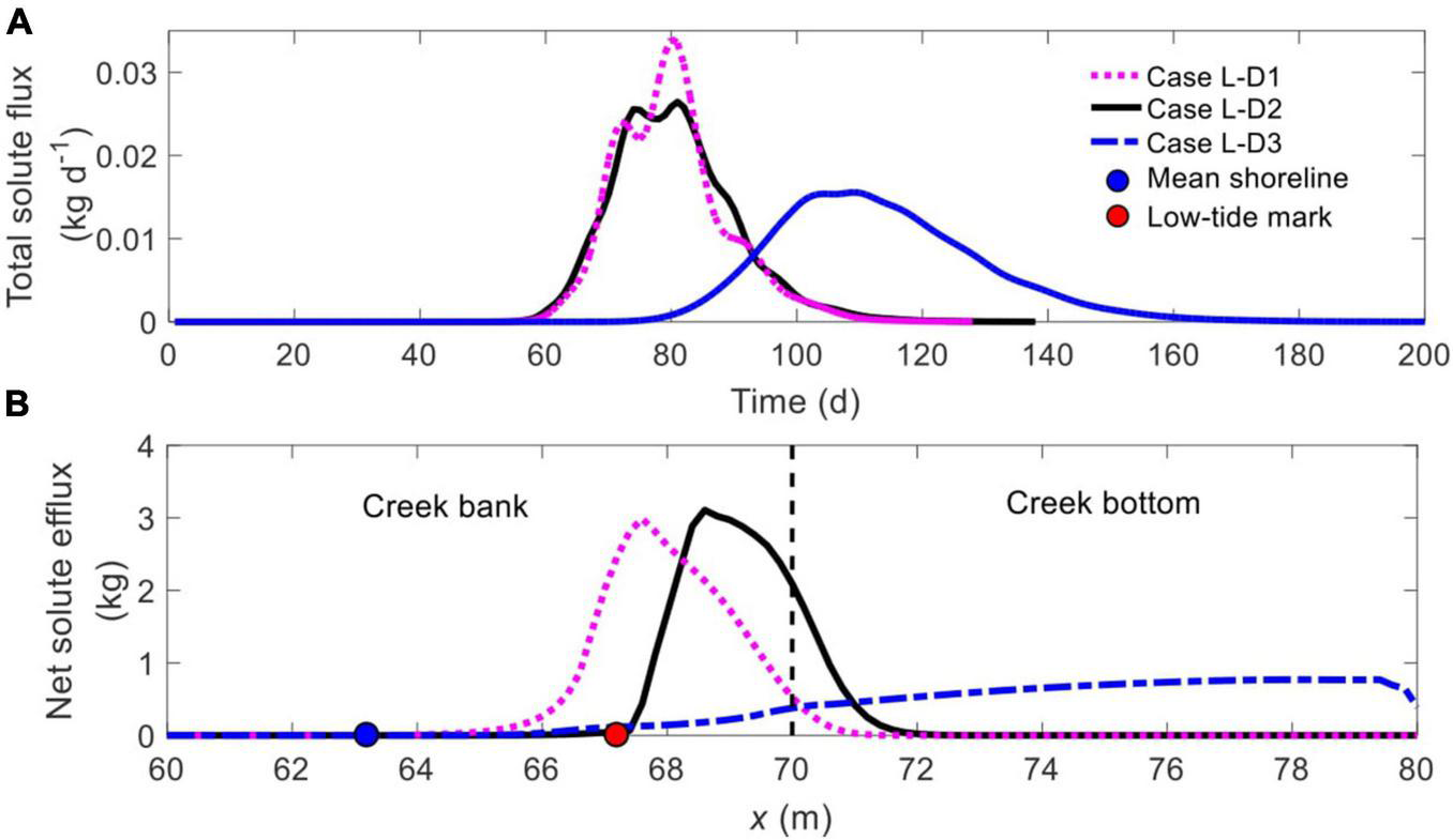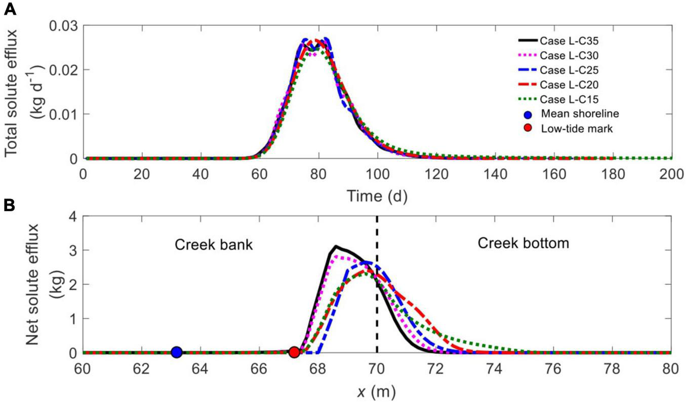 The early episode of solute discharge (from the marsh platform) in Case H occurs between x = 10.6 m and x = 15.6 m, one landward segment of the marsh platform (subplot in Figure 3B). Meanwhile, soil stratification narrows down the solute discharge zone along the tidal creek, reducing the width from 7.2 m (x = 66.4 ∼ 73.6 m) in Case H to 4.6 m in Case L (x = 67.2 ∼ 71.8 m), a reduction of 36%. Correspondingly, the maximum spatial solute efflux in Case L is much higher than that in Case H. In addition, solute plume in Case H discharges across both intertidal zone (left side of the cyan node) and subtidal zone (right side of the cyan node), but the discharge zone is shifted to be entirely in the subtidal zone in Case L.
