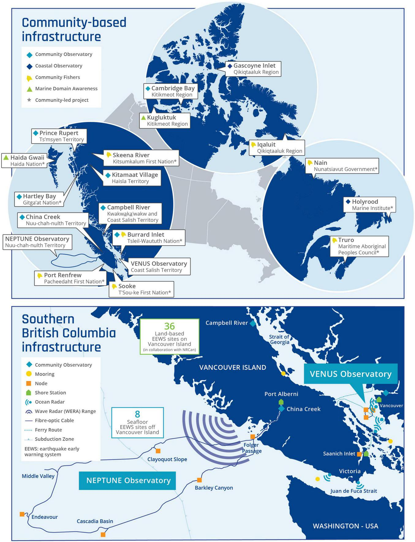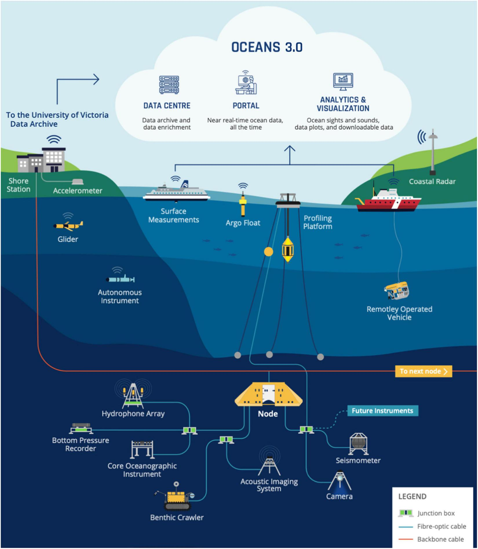 Ocean Networks Canada’s infrastructure includes large telecommunication cabled networks (NEPTUNE and VENUS; Figure 1), community-based networks along all three of Canada’s ocean coasts, mobile systems on ferries, and land-based sensors that support coastal radar, weather stations, ship traffic, earthquake early warning, and tagged marine bird detection.