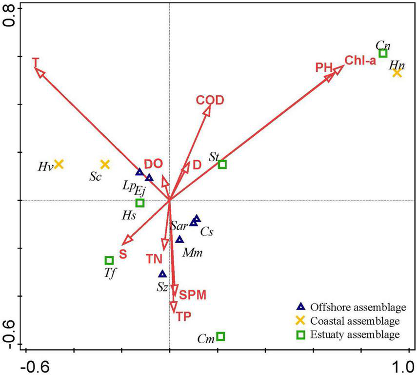 The ichthyoplankton assemblage structure and its relationship with environmental factors was analyzed by canonical correspondence analysis (CCA) (CANOCO Software, version 5.0). Only species that occurred in >0.5% of the catches were included in the analysis. Fourteen species found between 2013 and 2020 were included in the analyses. The species abundance data were lg(x + 1) transformed to reduce the dominance effects of some species (Clarke and Warwick, 2001; Zhang et al., 2015). These 14 species and 10 environmental factors were used in the CCA.