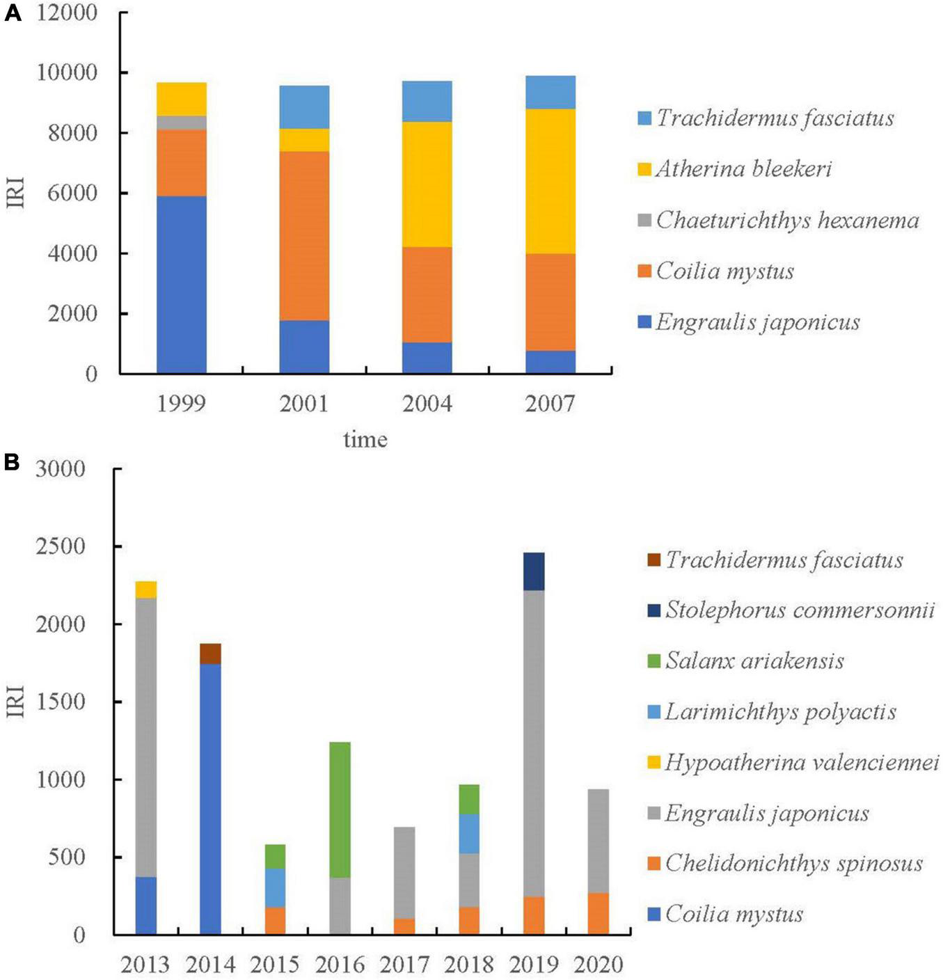 In total, 1,291 ichthyoplankton individuals, belonging to 26 species in 17 families, were captured in the Yangtze Estuary in spring 2013–2020. The scientific names, family, ecological guilds, and IRI values for the assemblages are shown in Table 1. The dominant species were Coilia mystus, Chelidonichthys spinosus, Engraulis japonicus, Hypoatherina valenciennei, Larimichthys polyactis, Salanx ariakensis, Stolephorus commersonnii, and Trachidermus fasciatus. Most of the species with low abundance were collected occasionally.