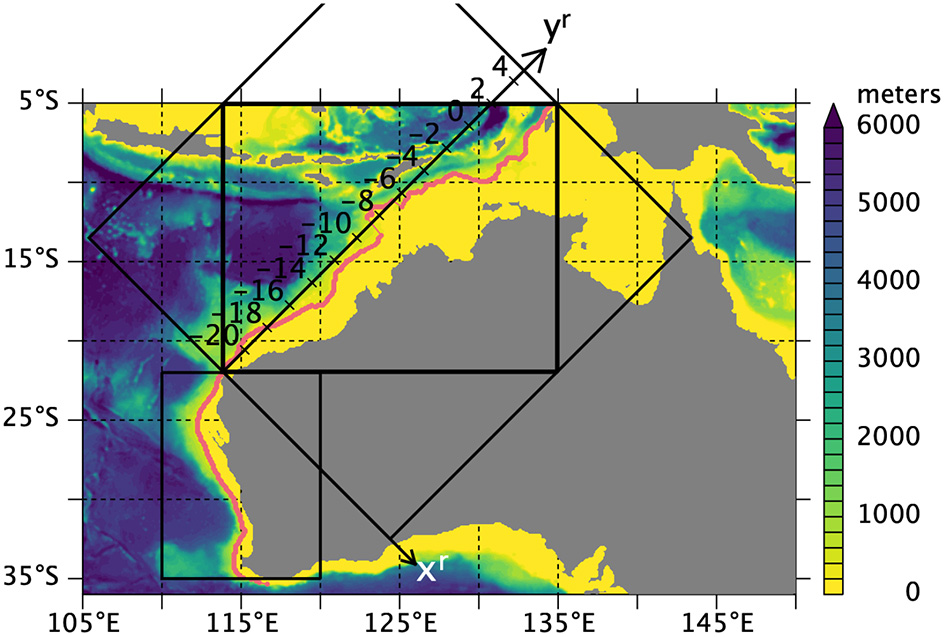 Along the west coast of Australia, this manual procedure was not necessary because the 200-m isobath is relatively regular and largely oriented north–south. Along the northwest coast, in contrast, the 200-m isobath is complex (Figure 1), necessitating some manual removal. In particular, the removal of the concave shapes of the 200-m isobath at about 123°E, 13°S and 125°E, 12°S result in large jumps in ; see the jumps in the red curve in the xr direction northeast and southwest of yr = −8° in Figure 1.