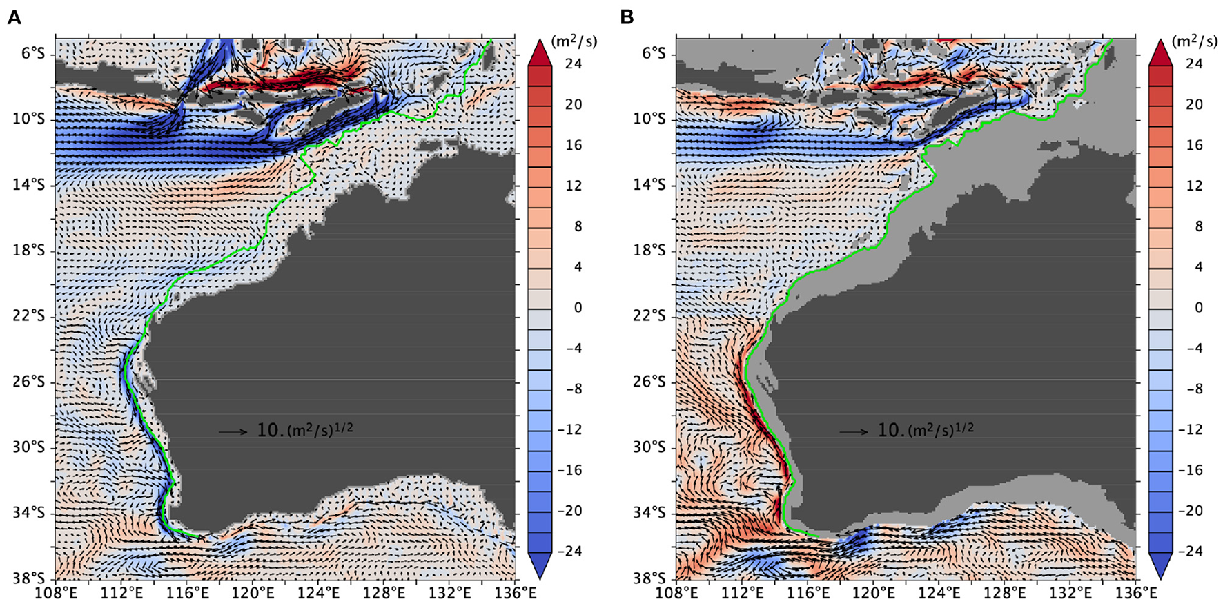 Mean flow vertically integrated (A) over 0–200 m and (B) over 200–800 m from OFES2. The color shading shows the “longshore” component of the transport vector, that is, V poleward of 22°S and Vr equatorward of it. To reduce the clutter, the arrows are scaled by the square root of the length: U/|U|1/2. The green curve approximately follows the 200-m isobath (section 2.2.2).
