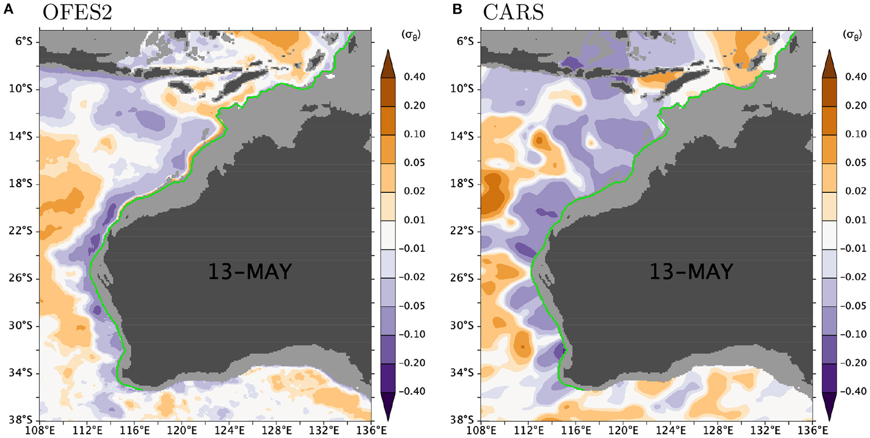 Potential density anomaly (A) for OFES2 and (B) for CARS Aus8 at 270 m on May 13. This depth is chosen because the density anomaly associated with the northeastward undercurrent is largest (Figure 5B). The green curve approximately follows the 200-m isobath (section 2.2.2).