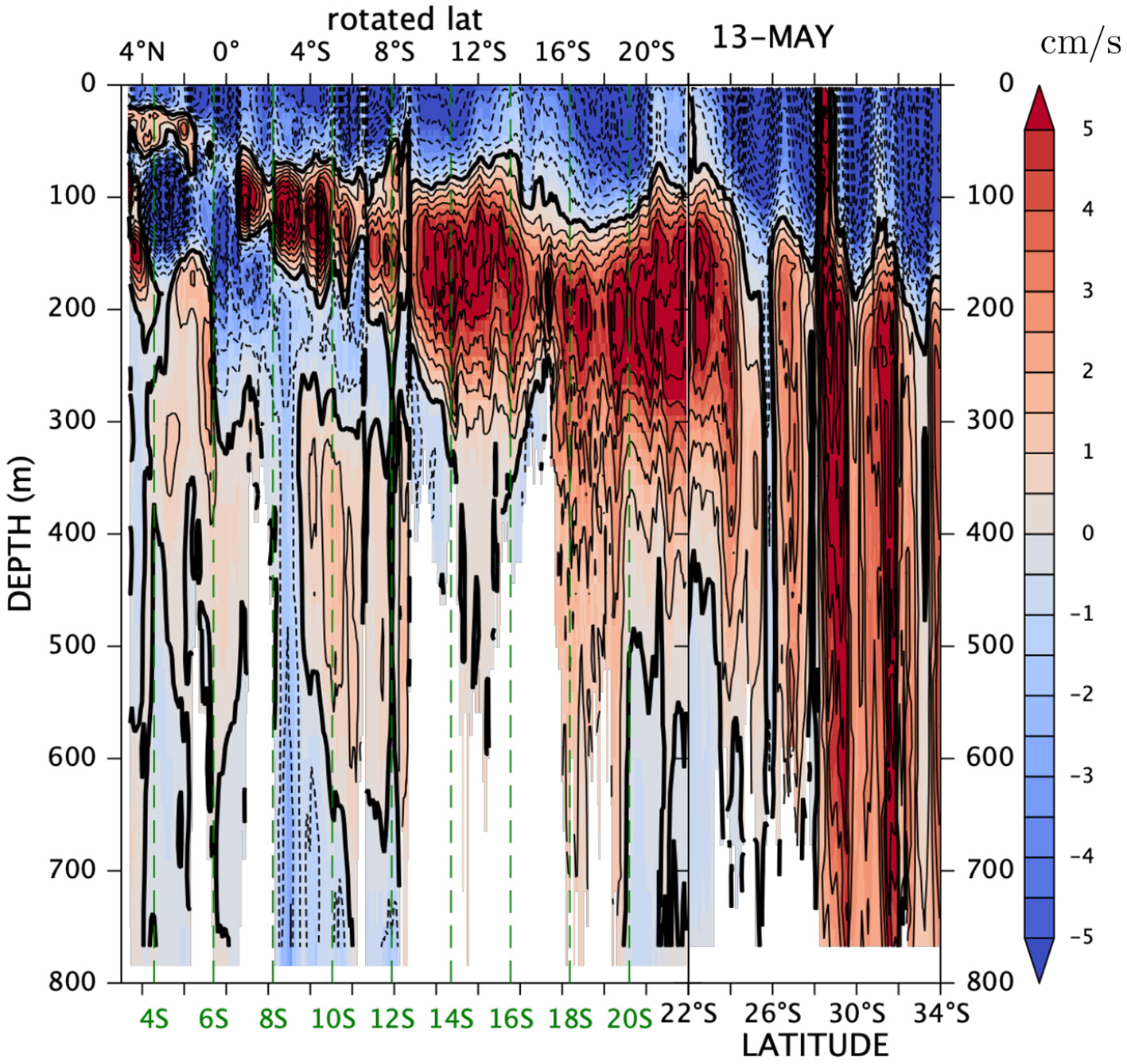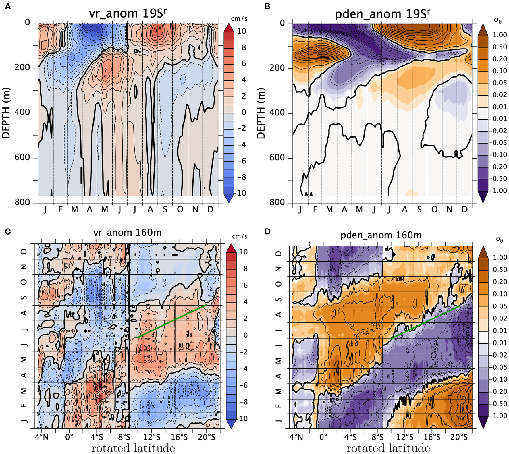 Annual anomaly of vr (shaded) across the (A) 13°Sr (15.6°S) and (B) 19°Sr (19.9°S) sections on May 13. The green contours show potential density at an interval of 0.2σθ.