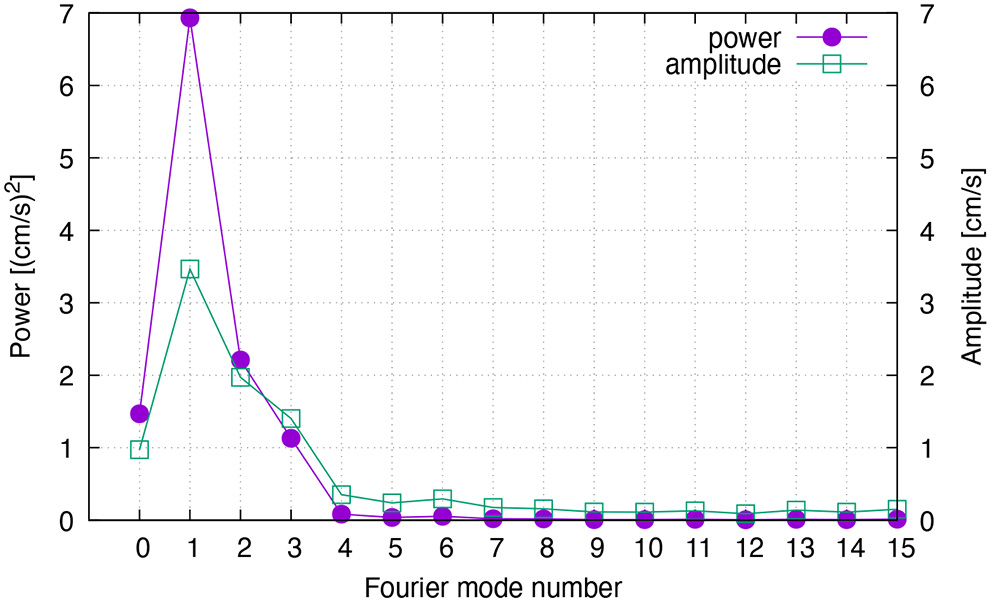 Figure 8 shows the spectrum of longshore velocity over the region where the seasonal undercurrent is strong on the continental slope along the northwest coast. The annual signal is the strongest followed by the 1/2-annual (semi-annual) and the 1/3-annual. The mean flow, which is negative (southwestward, not shown), is less than 1 cm/s. In what follows, we focus on Fourier modes n = 1, 2, 3.