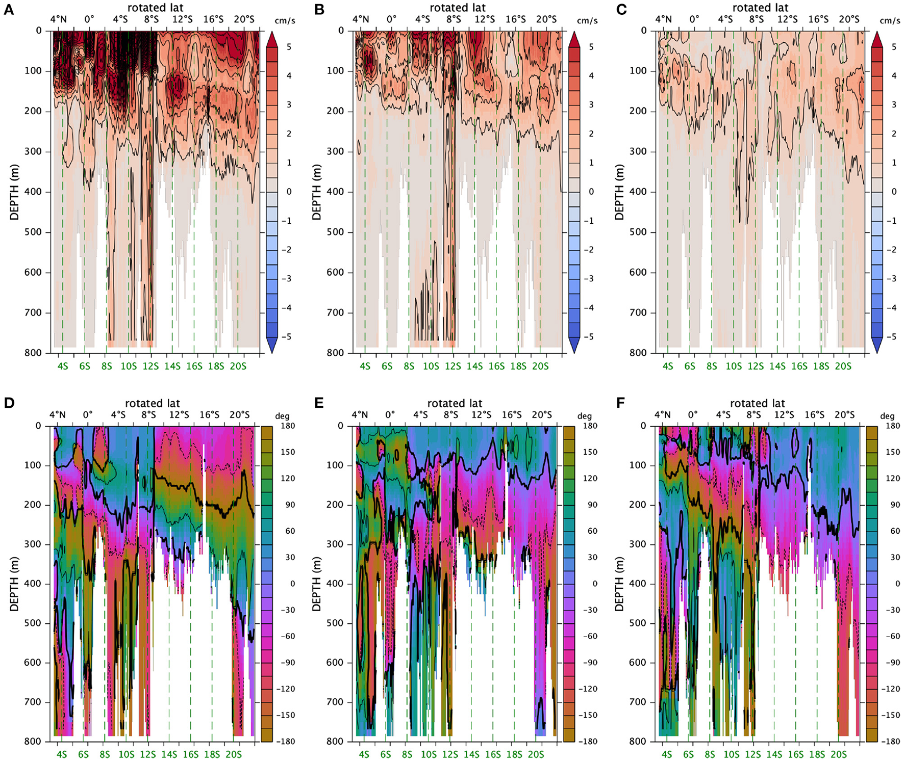 Figure 9 shows the amplitude of longshore velocity for the n = 1–3 modes. South of 9°Sr (12.8°S) and below the surface maximum, there is a band of high amplitude that corresponds to the seasonal undercurrent shown in Figure 6. The amplitudes of higher harmonics are generally smaller and the cores shift to shallower depths south of 9°Sr. The phase field for the annual mode (Figure 9D) shows relatively smooth upward and southwestward propagation south of 9°Sr. At ~300 m, phase θ~0 (indicated by a thick contour line) and θ increases upwward past 90° (thin solid line) and then past 180° (thick line), which is the same as −180°, and keeps increasing from −180° past −90° (thin dashed line). In contrast, there is a sharp jump in phase across 9°Sr. The other two modes show a similar vertical propagation south of 9°Sr.