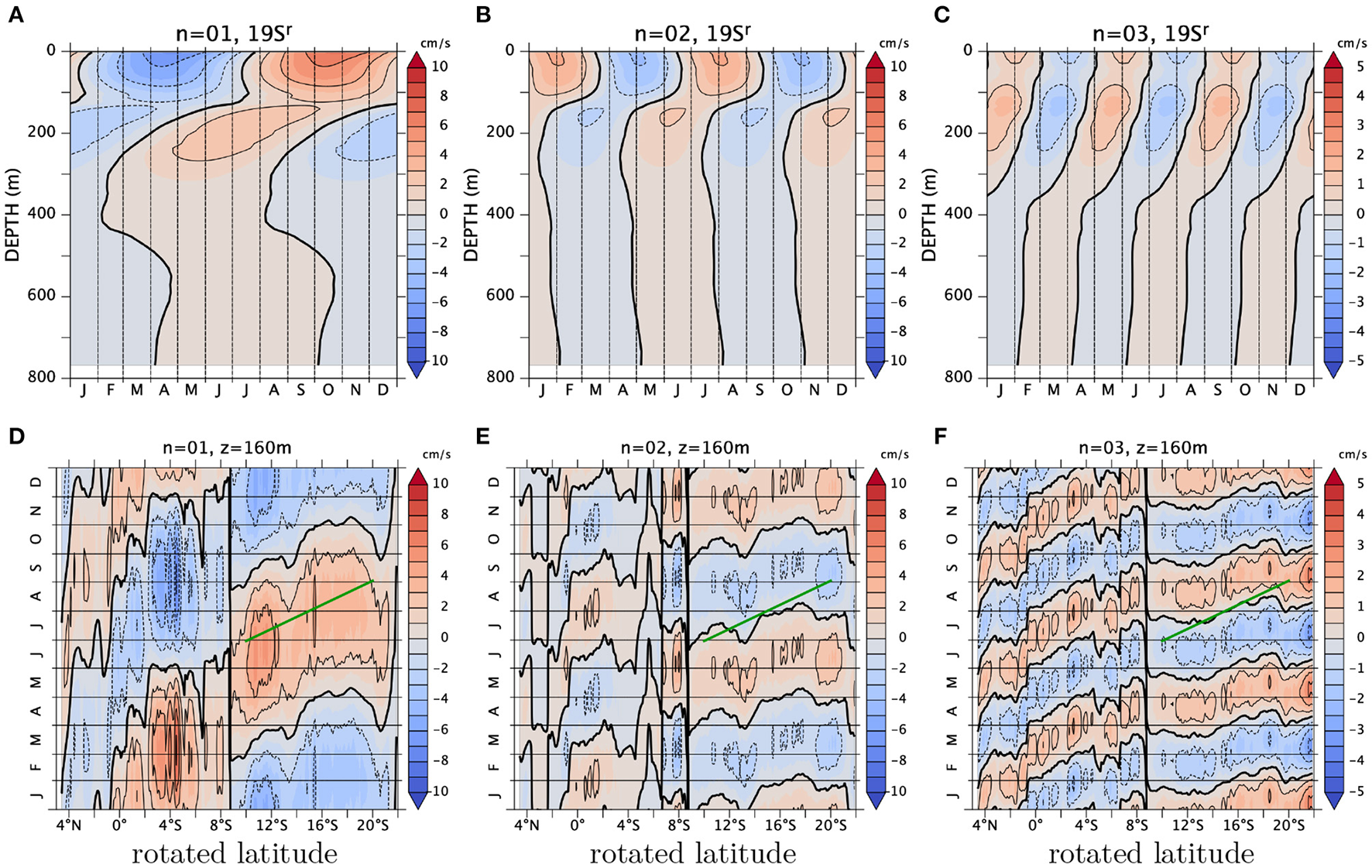 (A–C) z-t Hovmöller diagrams at 19°Sr and (D–F)y-t Hovmöller diagrams at 160 m for the annual (A,D), the 1/2-annual (B,E), and the 1/3-annual (C,F) harmonics of longshore velocity averaged over the xc strip. The green lines indicate a phase speed of cy = −0.2m/s.