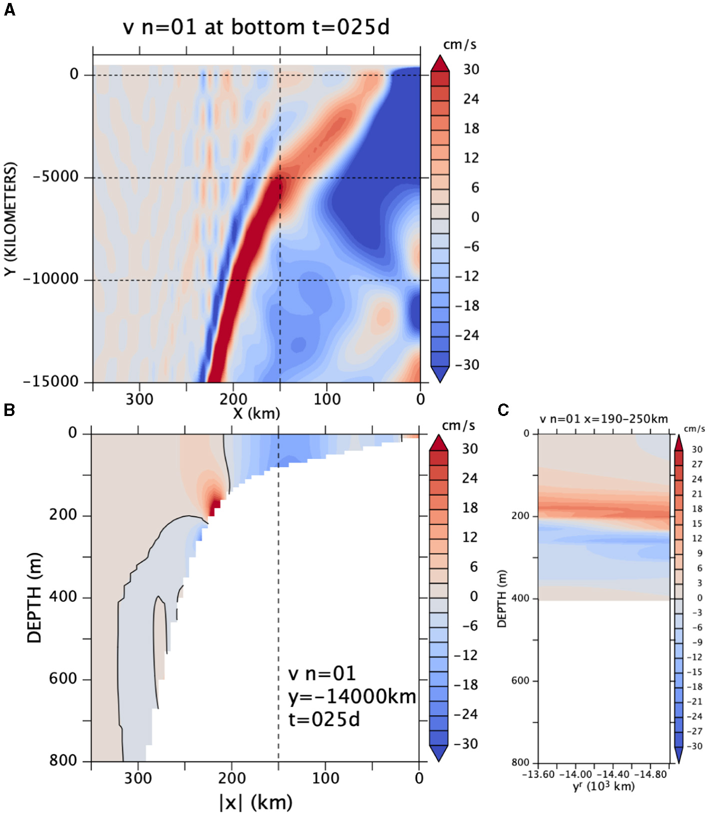 v from the CTW model (A) along the bottom, (B) at y = −14,000 km, and (C) averaged over x = 190–250 km at an arbitrary time for the annual frequency. The y-range for (C) is the southern-most 1,400 km of (A).