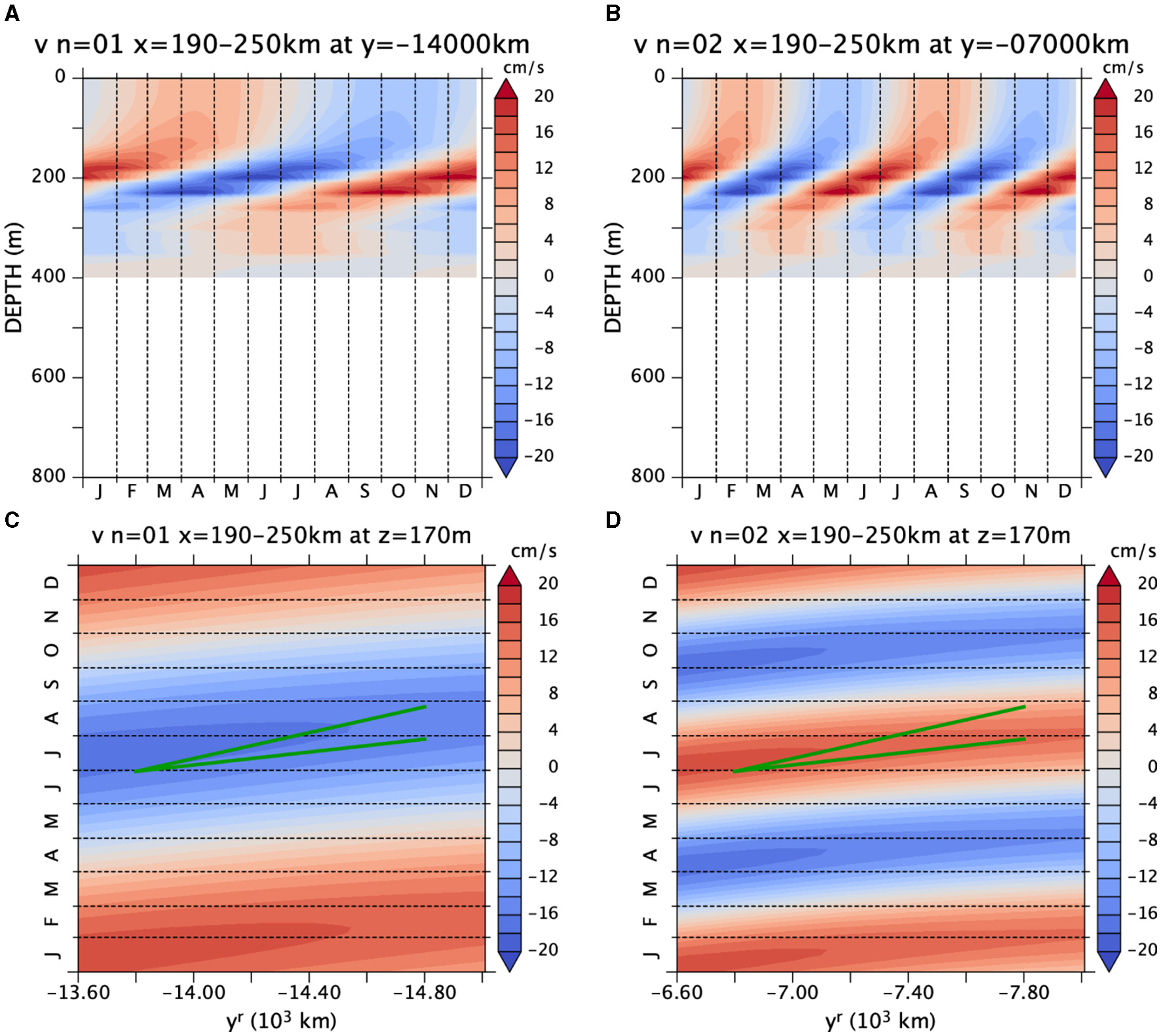 If one looks at the animation (not shown) of Figure 6 over the climatological year, one notices that the phase lines generally migrate upward and southwestward below the shelf break (100–150 m) along the northwest coast. Figure 7 shows Hovmöller diagrams at a fixed rotated latitude and at a fixed depth. Below the shelf-break depth (~150 m; see Figure 5B), phases propagate upwards from 300 to 150 m in both velocity and density fields. In density there appears to be downward phase propagation above the shelf break, but this is probably a false impression due to the winter deepening and summer shoaling of the mixed layer (See Figure 5 for the mixed layer depth during May). At 160 m phase propagation is southward (Figures 7C,D). Its speed is roughly 0.2m/s, which is indicated by the green line. As discussed later, the region of southward and upward phase propagation deepens southward, reminiscent of the downward-southward slope in Figure 6.