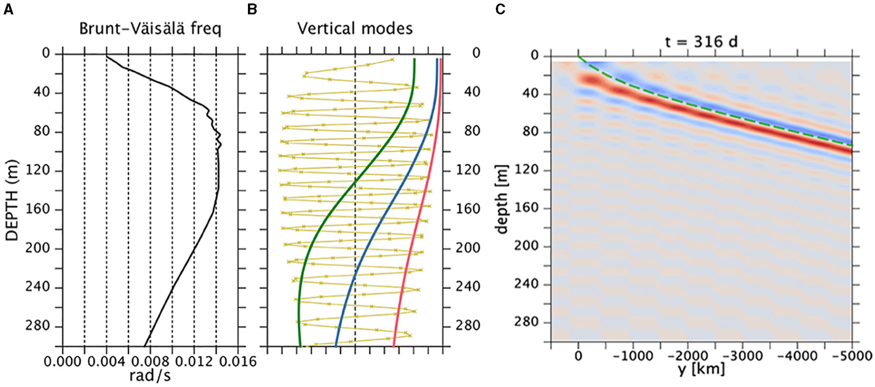 (A) Mean Brunt-Väisälä frequency N(z) based on WOA13 and (B) vertical modes 1, 2, 3, and 100 (red, blue, green, and yellow). The dots on the j = 100 mode indicate the gridpoints for the numerical calculation of Equation (4). (C) Meridional velocity (snapshot at an arbitrary time and at x = 0, eastern boundary) of coastal Kelvin wave on an f plane forced by an annual wind. The velocity field is constructed as a sum of 100 modes [ j = 1–100 in formula (1). The total depth is 5,000 m; only the upper 300 m is shown. The green dashed curve is a WKB ray starting from the southern edge of the forcing region (y > 0). See text for details.