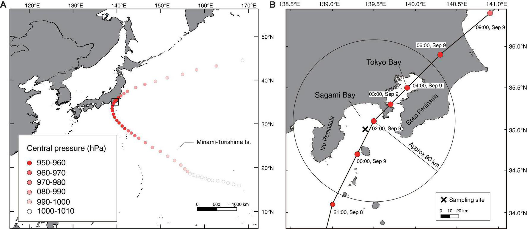 Track of typhoon Faxai off (A) the east coast of Japan and (B) over Sagami Bay. The colors of circles on (A,B) donate the central pressure (hPa) of Faxai. Large circle on (B) represents the area of the storm with the wind speed of > 25 m/s (02:00 September 9th). Cross on (B) donates sampling site.