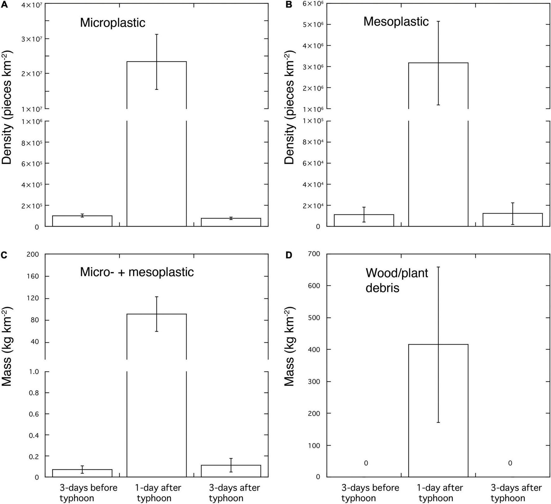 Changes in the density and mass of plastic and other debris 3-days before, and 1- and 3-days after typhoon passage: density (pieces km–2) of (A) microplastic and (B) mesoplastics, and mass (kg km–2) of (C) micro− + mesoplastics and (D) wood and plant debris. Error bars indicate standard deviation of mean.