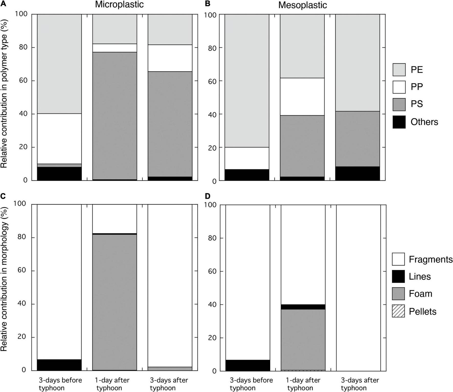 The morphological shapes of microplastics and mesoplastics collected before the typhoon passed were predominantly fragments including hard fragments and films (93.4 ± 5.9% in microplastics; 80.0 ± 20.0% in mesoplastics) followed by lines (6.6 ± 5.9% in microplastics; 13.3 ± 11.5% in mesoplastics) (Figures 3C,D). At 1-day after the typhoon, foamed particles, namely particles of expanded PS (EPS), were dominant in microplastics (81.7 ± 9.9%). Foamed particles were also an important component in mesoplastics (37.1 ± 17.9%) 1 day after the storm but the most dominant shapes seen were fragments (59.8 ± 15.1%). At 3-days after the storm, both microplastics and mesoplastics consisted mostly or entirely of fragments (97.8 ± 3.8 and 100.0 ± 0.0%, respectively).