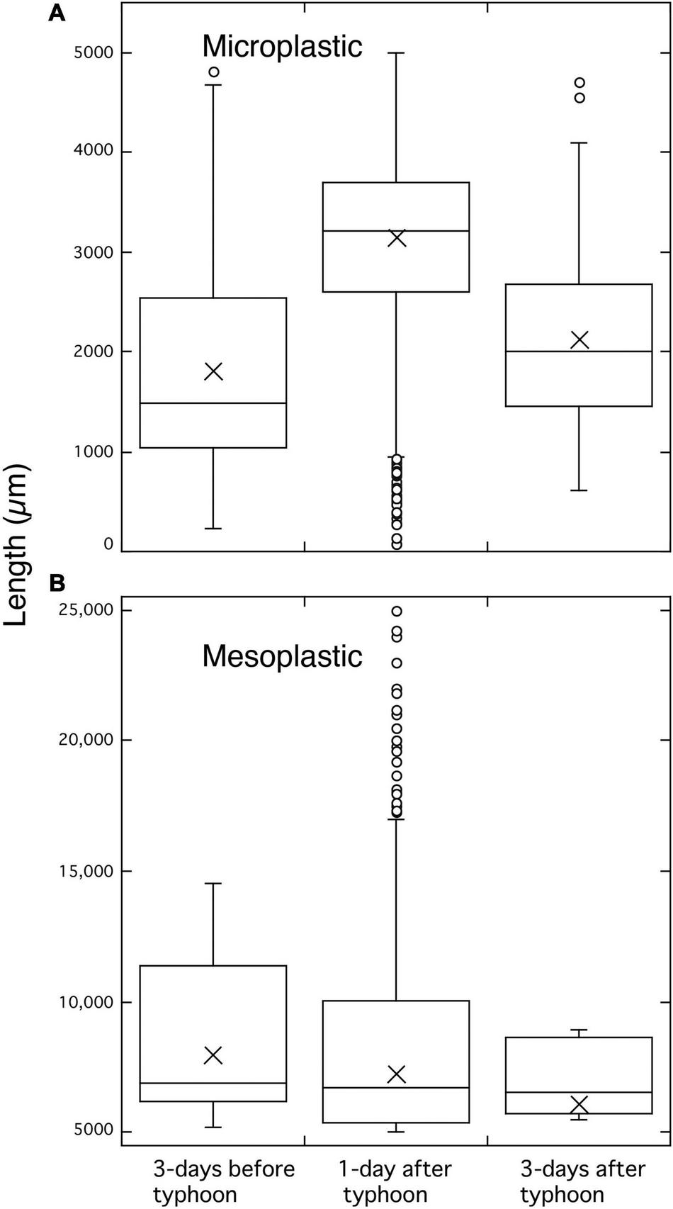 Changes in the length (μm) of (A) microplastics and (B) mesoplastics 1-day before and 1-day and 3-days after typhoon passage. The line in the middle of the boxes represents the median values; the tops and bottoms of the boxes denote the 75 and 25% quartiles, respectively, and the top and bottom of the errors show the maximum and minimum value, excluding outliers (circles). Crosses denote the mean data.