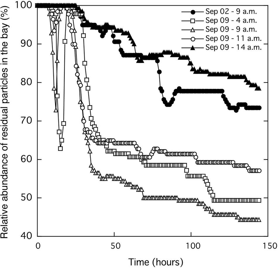 Particle model analysis showed that plastic particles entering the bay immediately after the passage of the typhoon were highly likely to be transported out of the bay to the open ocean. In contrast, plastic particles that entered the bay before the typhoon, or more than 12 h after the passage of the typhoon, were less likely to be transported from the bay to the open ocean (Figure 5, see also movies in Supplementary Material). Most particles released from the coastline at 2 and 7 h after the typhoon passed (i.e., 04:00 and 09:00 September 9th) remained in the bay for the first 24 h (>90%), but only < 50% (45.7–49.3%) continued to persist in the bay after 120 h due to leakage into the open waters (Figure 5). Similarly, particles released 9 h after the typhoon passage (11:00 September 9th) showed persistence of ca. 60% in the bay after 120 h. In contrast, particles released 12 h after the typhoon, or 1 week before the typhoon, showed relatively higher persistence in the bay with 78–82% still residing after 120 h.