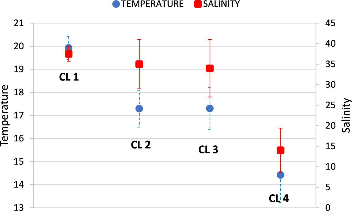Temporal dynamics of change between different environmental states are illustrated for three sites representative of the three types of marine environment (open sea, coastal sea, transitional/estuarine waters) (Figure 2). Environmental data sets sampled at open sea sites belonged predominantly to CL 1 (58%), but occasionally there was a switch to CL 2 (23%) and CL 3 (19%). No data set from the open sea belonged to CL 4. Data sets from the coastal sea mostly belonged to CL 2 (37%) and CL 3 (36%), but frequently switched to CL 1 (24%) and much less frequently to CL 4 (3%). Finally, most records from transitional/estuarine waters belong to CL 4 (51%), but occasionally switched to CL 2 (23%) and CL 3 (26%). No data set from transitional/estuarine waters belonged to CL 1. These patterns are also confirmed by salinity, which on average has the highest value in CL 1 (37.85) and the lowest in CL 4 (14.83), while the variation in salinity is large in CL 2 and CL 3 (Figure 1).