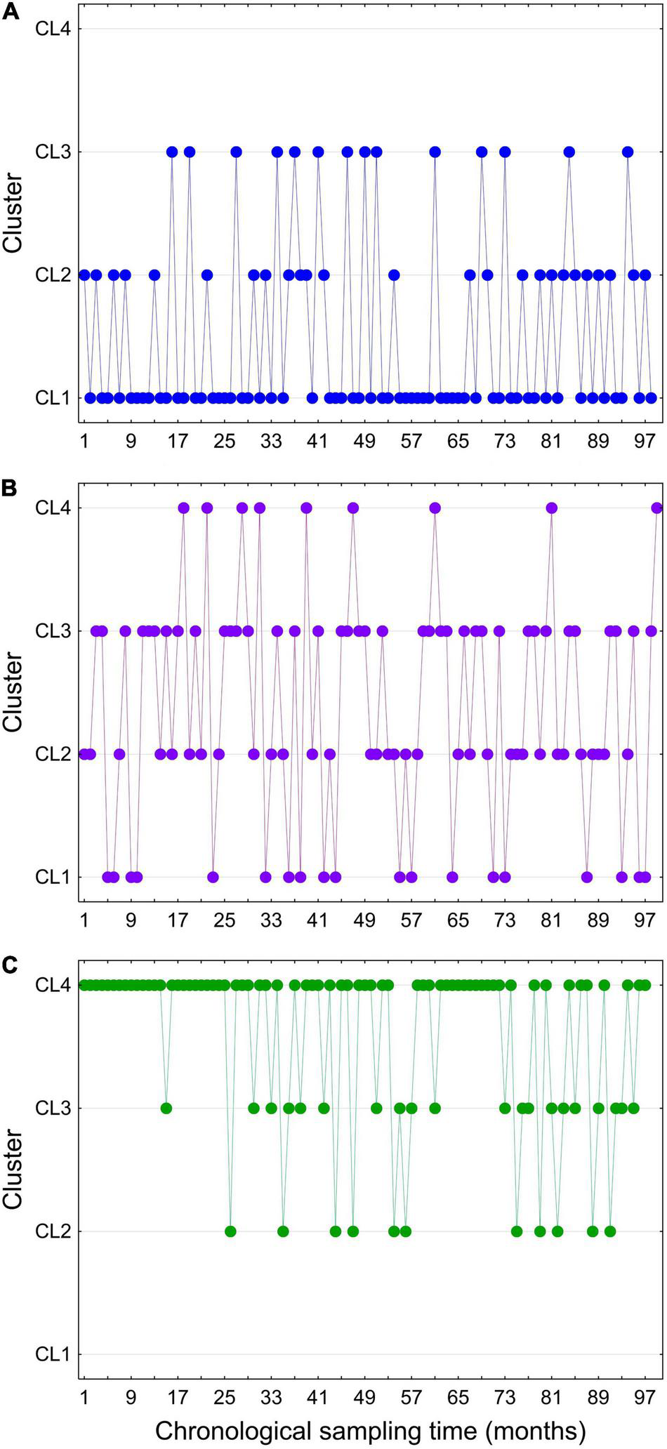 Temporal changes in the state of environmental conditions (expressed as switching between different clusters) at sites typical of the open sea (A), coastal sea (B) and transitional/estuarine waters (C).